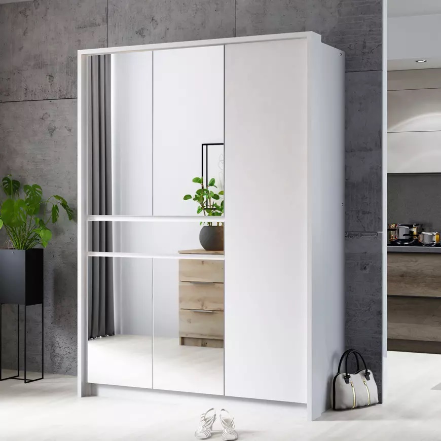 Szafa Split 157 została zaprojektowana z myślą o maksymalnej wygodzie użytkowania. Drzwi uchylne zapewniają łatwy dostęp do wnętrza szafy, a centralne oraz lewe drzwi wyposażone są w praktyczne lustra, które optycznie powiększa przestrzeń i dodaje jej funkcjonalności. Dzięki braku uchwytów, front szafy prezentuje się niezwykle nowocześnie i minimalistycznie, co wpisuje się w aktualne trendy aranżacyjne.
