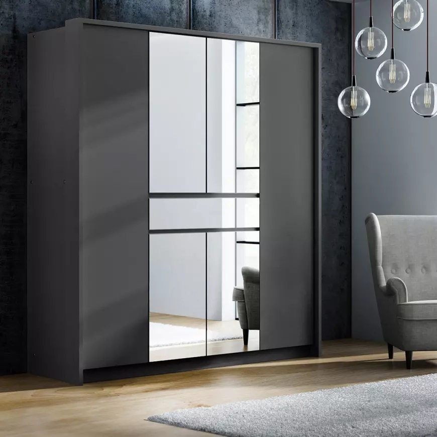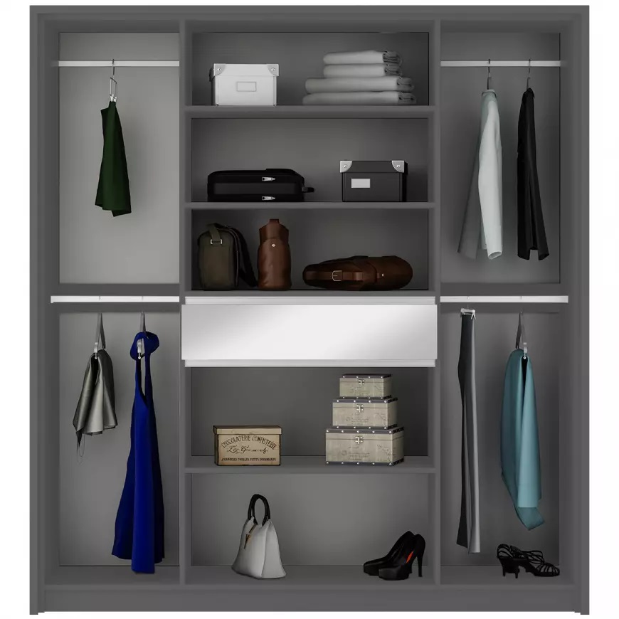 Ta wielodrzwiowa szafa z uchylnymi drzwiami została zaprojektowana z myślą o maksymalnej wygodzie użytkowania. Centralne drzwi są wyposażone w lustro, które nie tylko pełni funkcję praktyczną, ale również optycznie powiększa przestrzeń, co jest szczególnie cenne w mniejszych pomieszczeniach. Brak uchwytów na drzwiach dodaje szafie minimalistycznego wyglądu, podkreślając jej nowoczesny styl i elegancję.