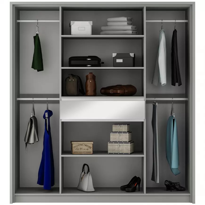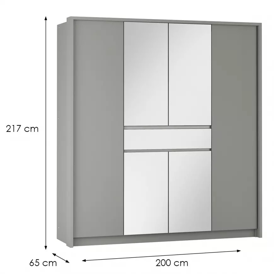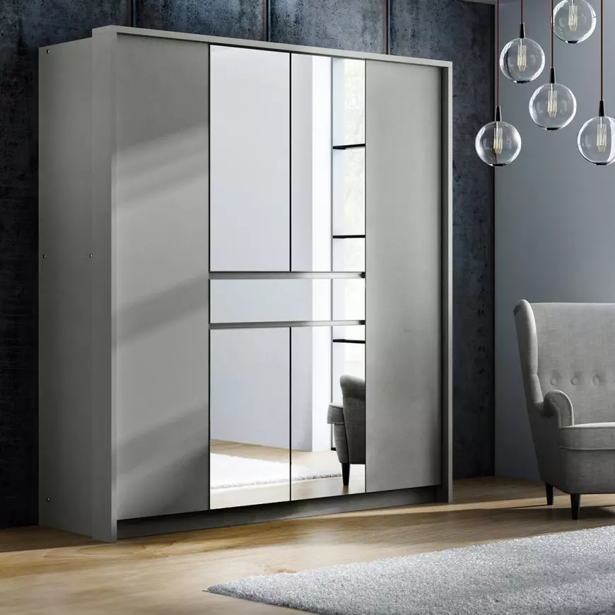 Ta wielodrzwiowa szafa z uchylnymi drzwiami zaprojektowana została z myślą o maksymalnej wygodzie użytkowania. Lustro umieszczone na środkowych drzwiach nie tylko spełnia funkcję praktyczną, ale również wizualnie powiększa przestrzeń, co jest szczególnie ważne w mniejszych pomieszczeniach. Brak uchwytów dodaje jej minimalistycznego wyglądu, który idealnie wpisuje się w aktualne trendy wnętrzarskie, tworząc czyste i eleganckie linie.