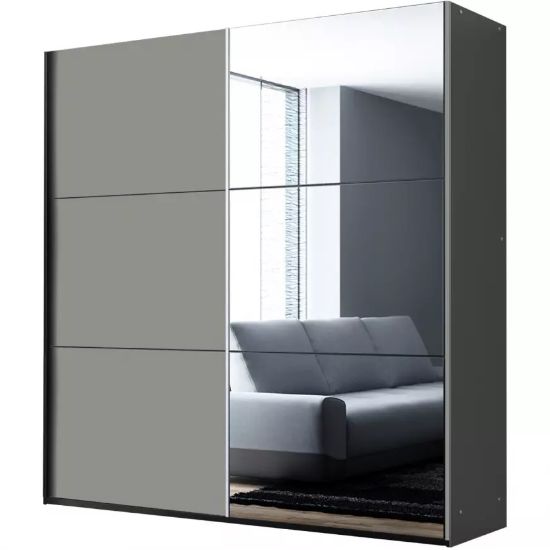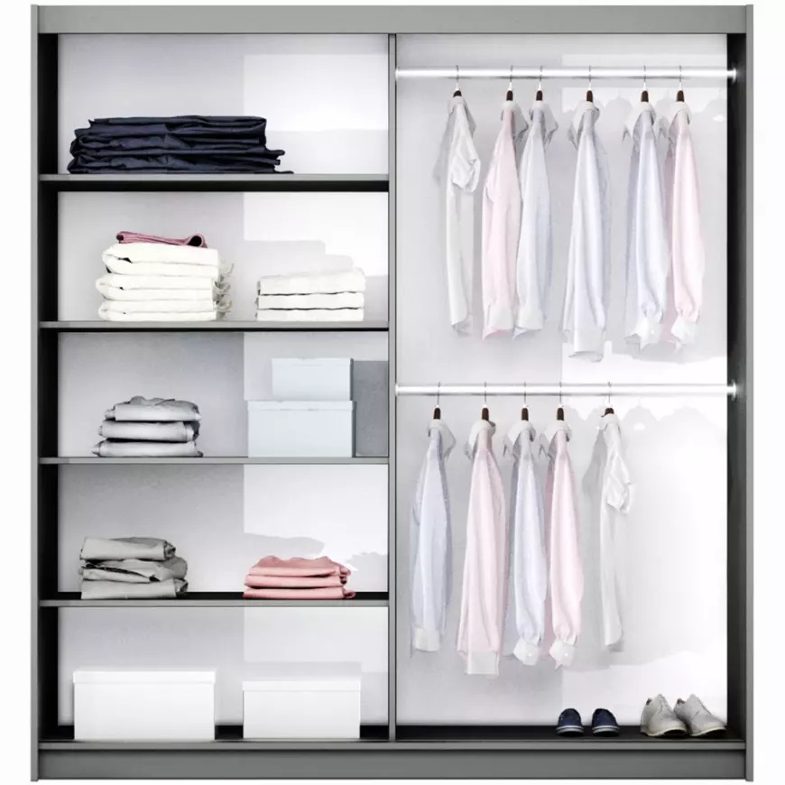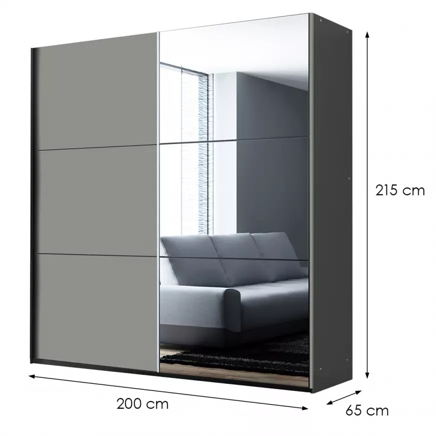 Model Vigo 200 charakteryzuje się dwudrzwiową konstrukcją z drzwiami przesuwnymi, co jest bardzo praktycznym rozwiązaniem, szczególnie w pomieszczeniach o ograniczonej przestrzeni. Przesuwne drzwi nie tylko oszczędzają miejsce, ale także zapewniają łatwy dostęp do całej zawartości szafy. Na prawych drzwiach umieszczone jest lustro, które dodatkowo pełni funkcję praktyczną i optycznie powiększa przestrzeń.