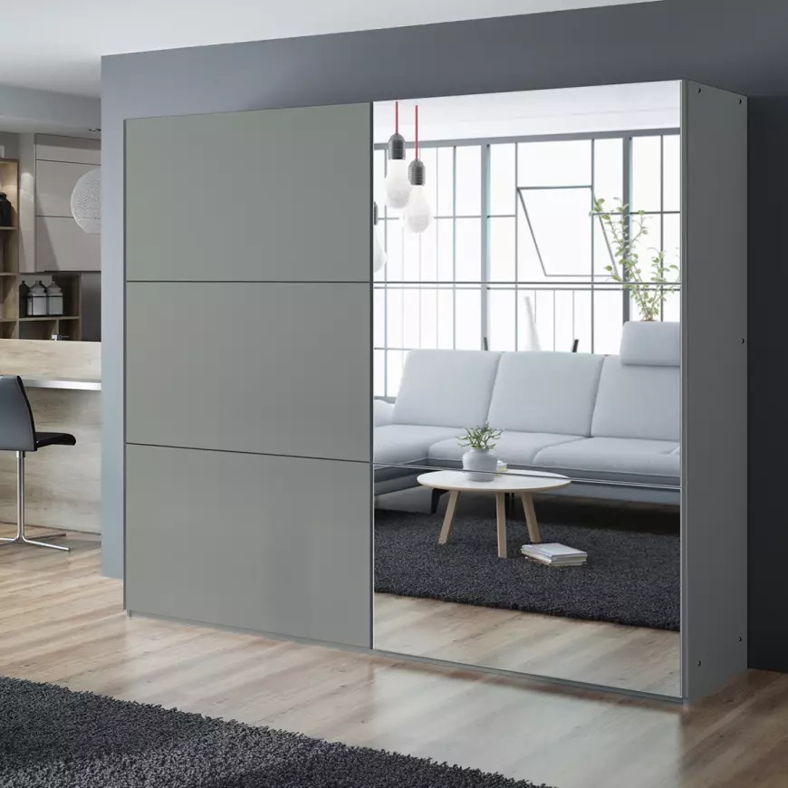 Drzwi przesuwne to praktyczne rozwiązanie, które pozwala zaoszczędzić miejsce i ułatwia dostęp do wnętrza szafy. Dzięki temu, szafa Vigo 250 sprawdzi się świetnie nawet w mniejszych pomieszczeniach, gdzie każdy centymetr przestrzeni jest na wagę złota. Dodatkowo, lustro umieszczone na prawych drzwiach nie tylko pełni funkcję użytkową, ale również optycznie powiększa pomieszczenie, dodając mu głębi.