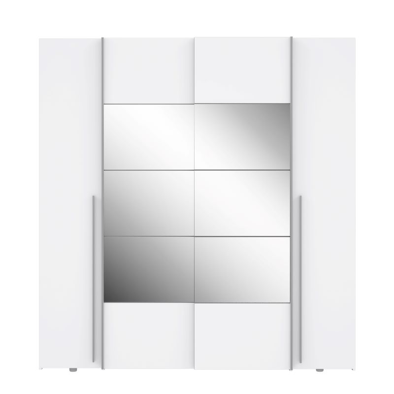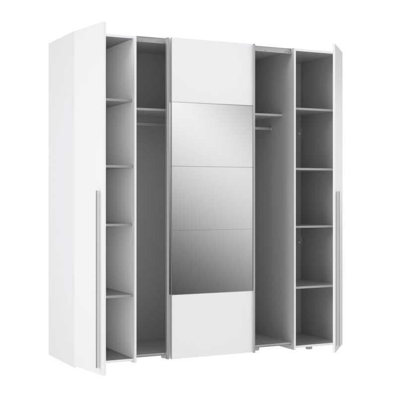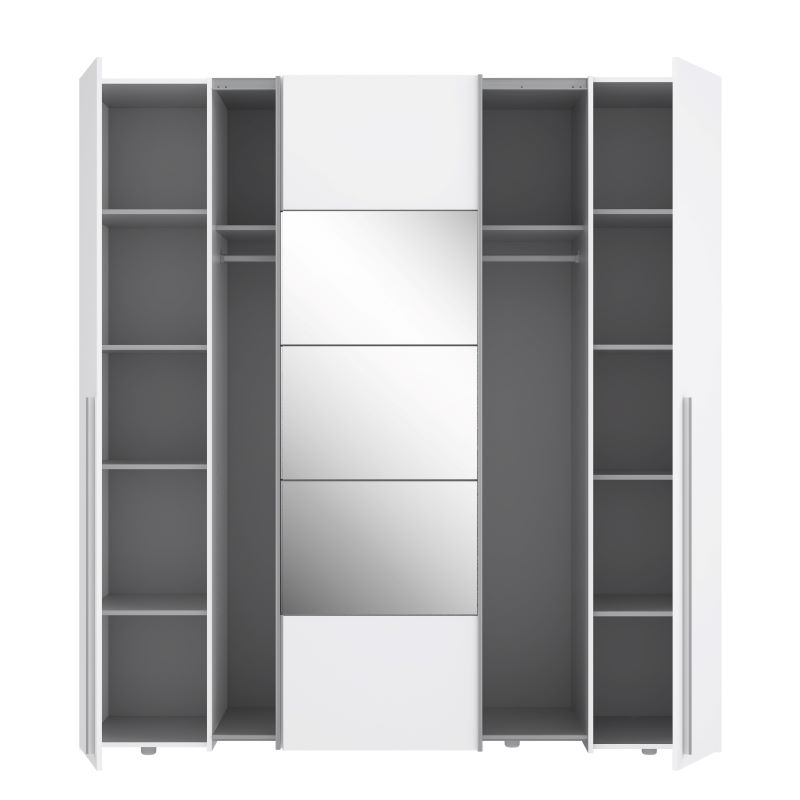 Szafa Narvil NRGS32512 została zaprojektowana z myślą o praktycznym wykorzystaniu przestrzeni. Po obu stronach, za uchylnymi drzwiami, znajduje się osiem półek, po cztery z każdej strony. To idealne miejsce do przechowywania ubrań, butów, czy innych drobiazgów. W części środkowej, za drzwiami przesuwnymi, zastosowano dwie przestronne półki oraz dwa drążki do powieszenia ubrań na wieszakach. Dzięki temu, szafa oferuje różnorodne możliwości organizacji przestrzeni w zależności od indywidualnych potrzeb.