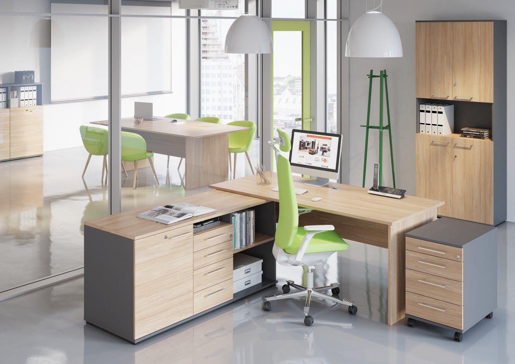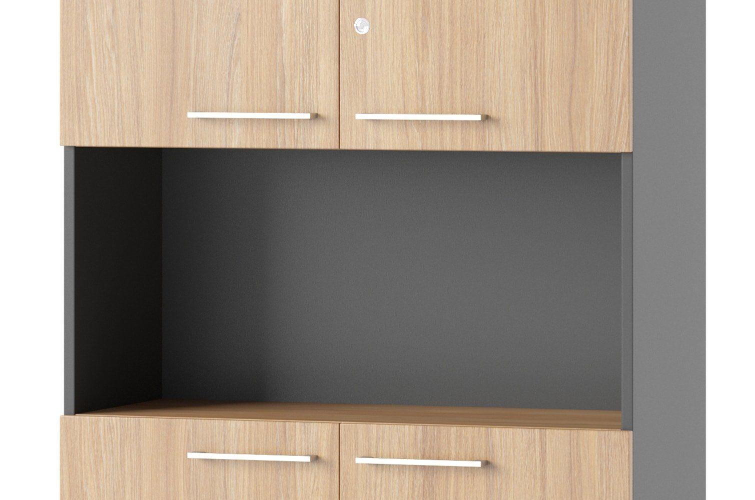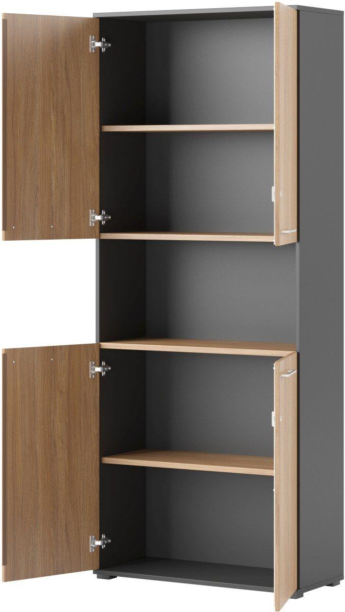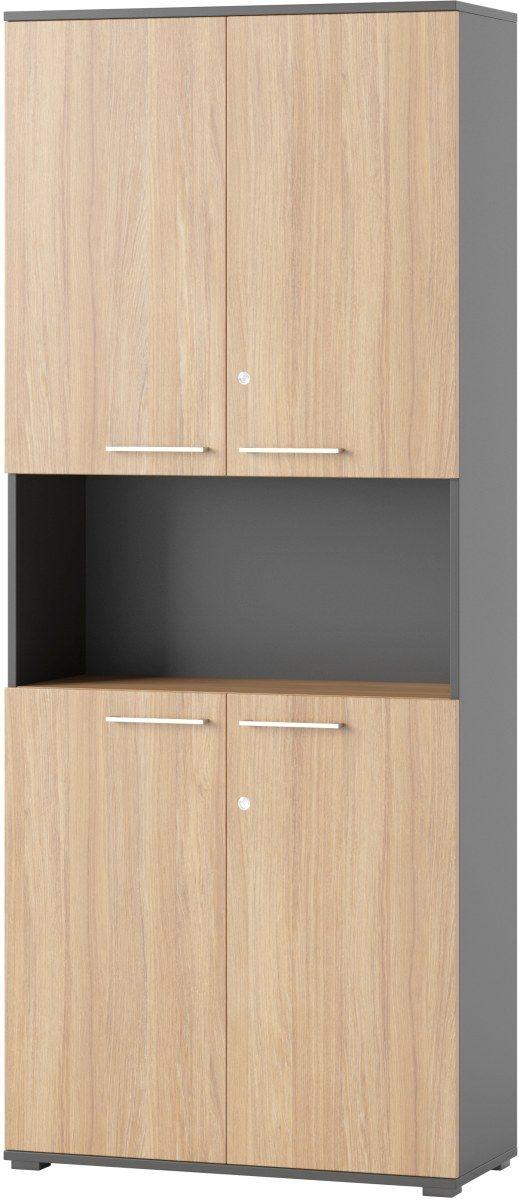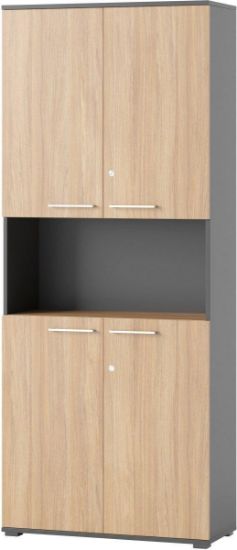 Szafa czterodrzwiowa idealna do przechowywania dokumentów, segregatorów i teczek, zamykana na klucz. Tego mebla nie może zabraknąć w dobrze urządzonym biurze, dzięki jasnym frontom w kolorze bursztynowego dębu i grafitowym korpusom meble wpasują się w nowoczesne przestrzenie. Funkcjonalność i dobry styl to główne cechy tego produktu. OMEGA 05 to regał, w którym znajdziemy aż 5 półek otwierane za pomocą metalowych uchwytów.