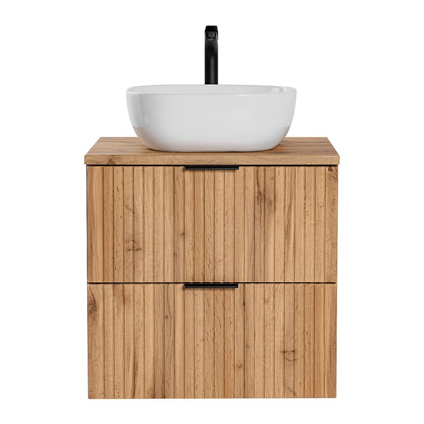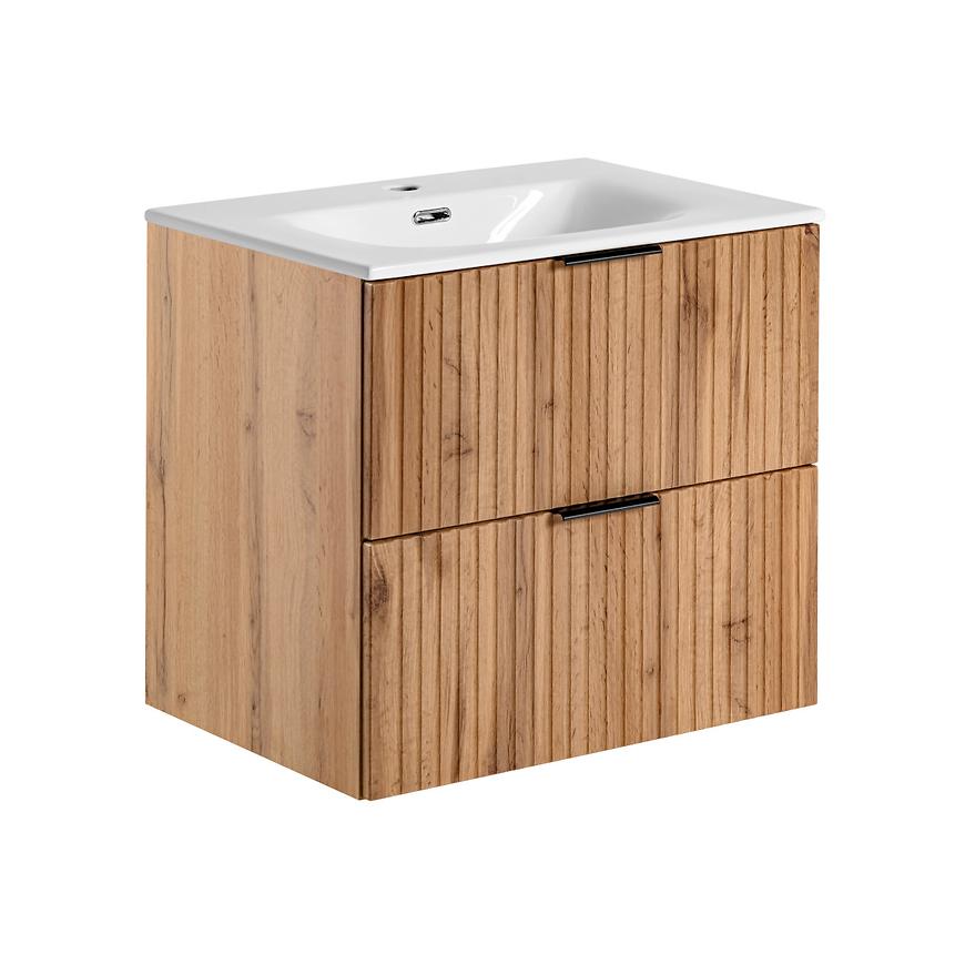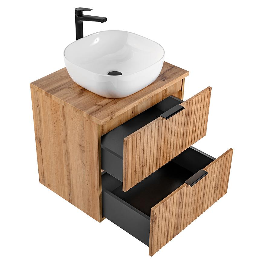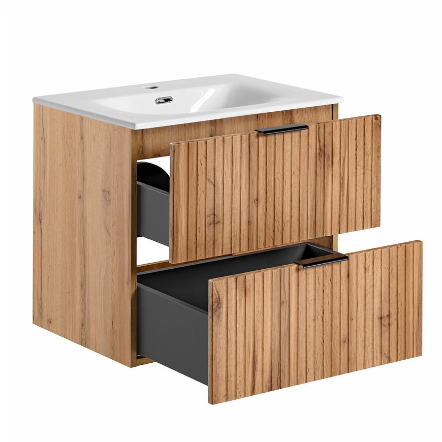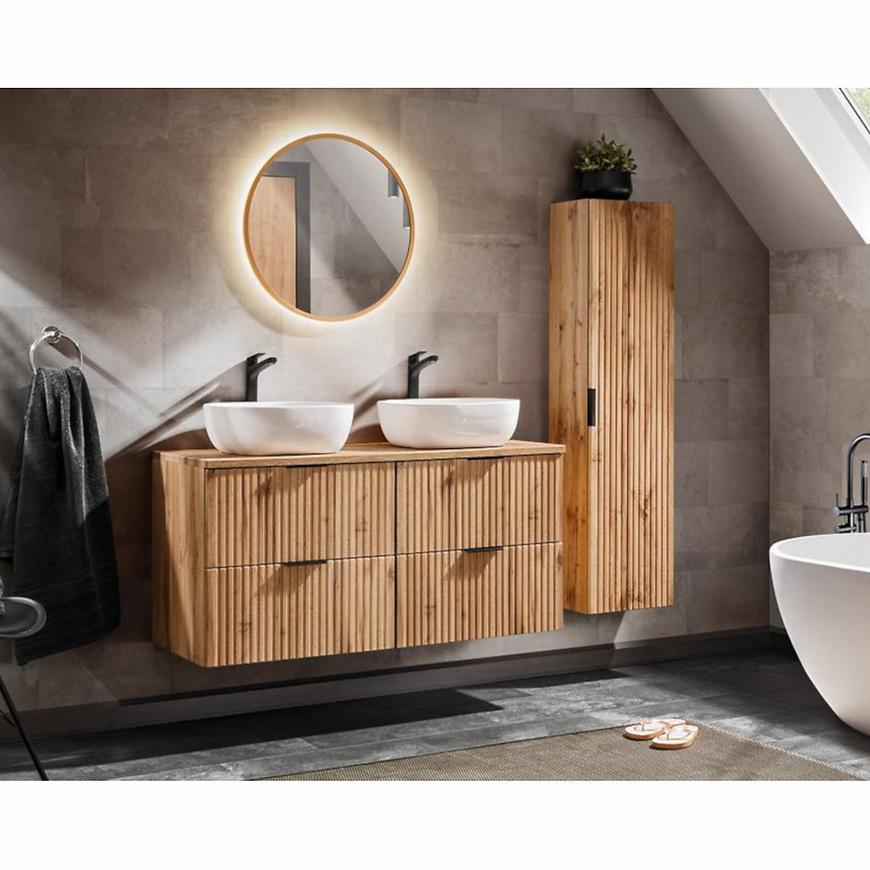 Fronty zostały wykonane z trwałej i eleganckiej płyty MDF, co nadaje wyjątkowej wytrzymałość oraz połyskujący efekt matowego wykończenia. Dzięki temu, meble prezentują się nie tylko stylowo, ale także są łatwe w pielęgnacji. Korpus wykonane jest z wysokiej jakości płyty wiórowej, co zapewnia stabilność i odporność na warunki panujące w łazience, takie jak wilgoć. Kolor dąb wotan dodaje meblom naturalnego uroku i ciepła, nadając wnętrzu przytulności.