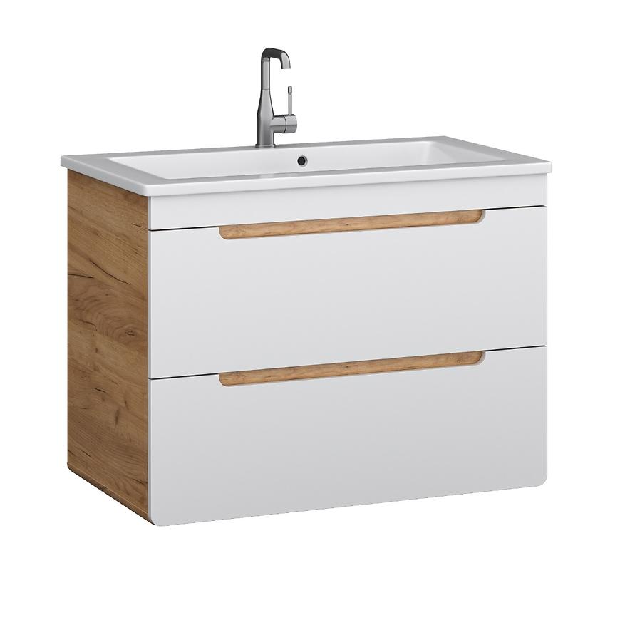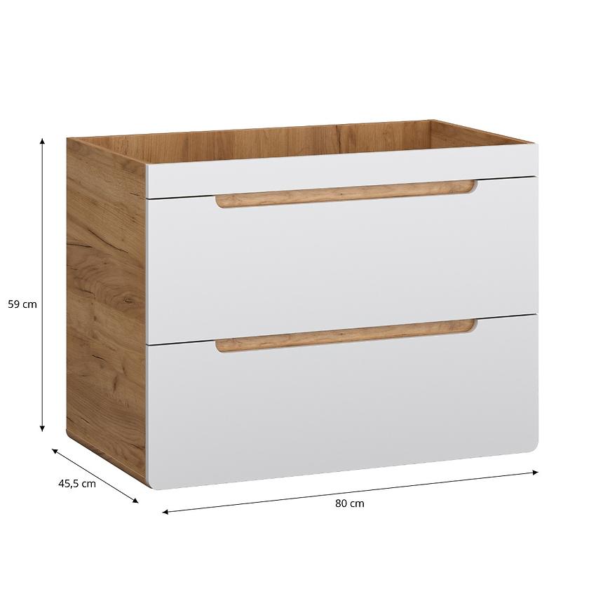 Szafka Bronx 80 dąb craft – biały połysk to podwieszana szafka łazienkowa o nowoczesnym i funkcjonalnym designie. Fronty wykonane z płyty MDF pokrytej folią PVC w białym połysku, korpus z płyty wiórowej w dekorze dąb craft. Posiada dwie pojemne szuflady z systemem samodomykania i frezowane uchwyty, które nie wymagają dodatkowych elementów. Produkt przeznaczony wyłącznie do łazienki, łatwy w montażu, łączący estetykę z wygodą codziennego użytkowania.
