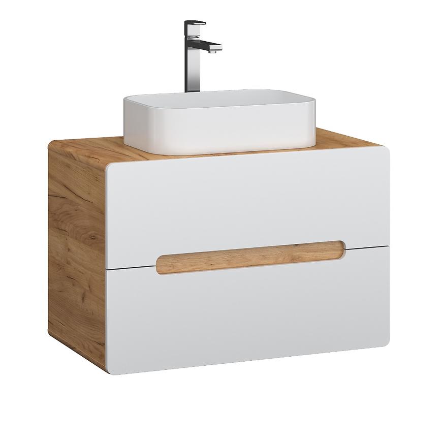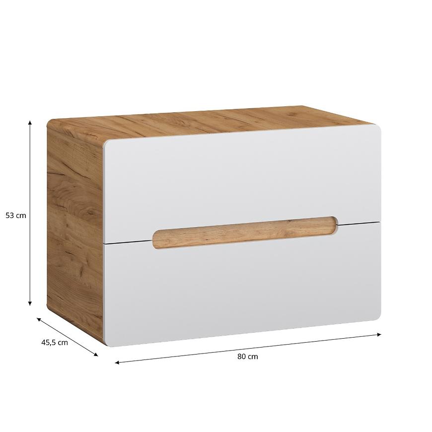 Szafka Bronx 80 z blatem dąb craft – biały połysk to nowoczesna podwieszana szafka łazienkowa o wymiarach 80×45,5×53 cm, wyposażona w dwie pojemne szuflady z systemem samodomykania i frezowanymi uchwytami. Fronty wykonano z płyty MDF pokrytej folią PVC w eleganckim białym połysku, a korpus z płyty wiórowej w dekorze dąb craft. Produkt przeznaczony do samodzielnego montażu łączy funkcjonalność z estetyką, oferując praktyczne miejsce do przechowywania akcesoriów łazienkowych. Zastosowanie wyłącznie w łazience.