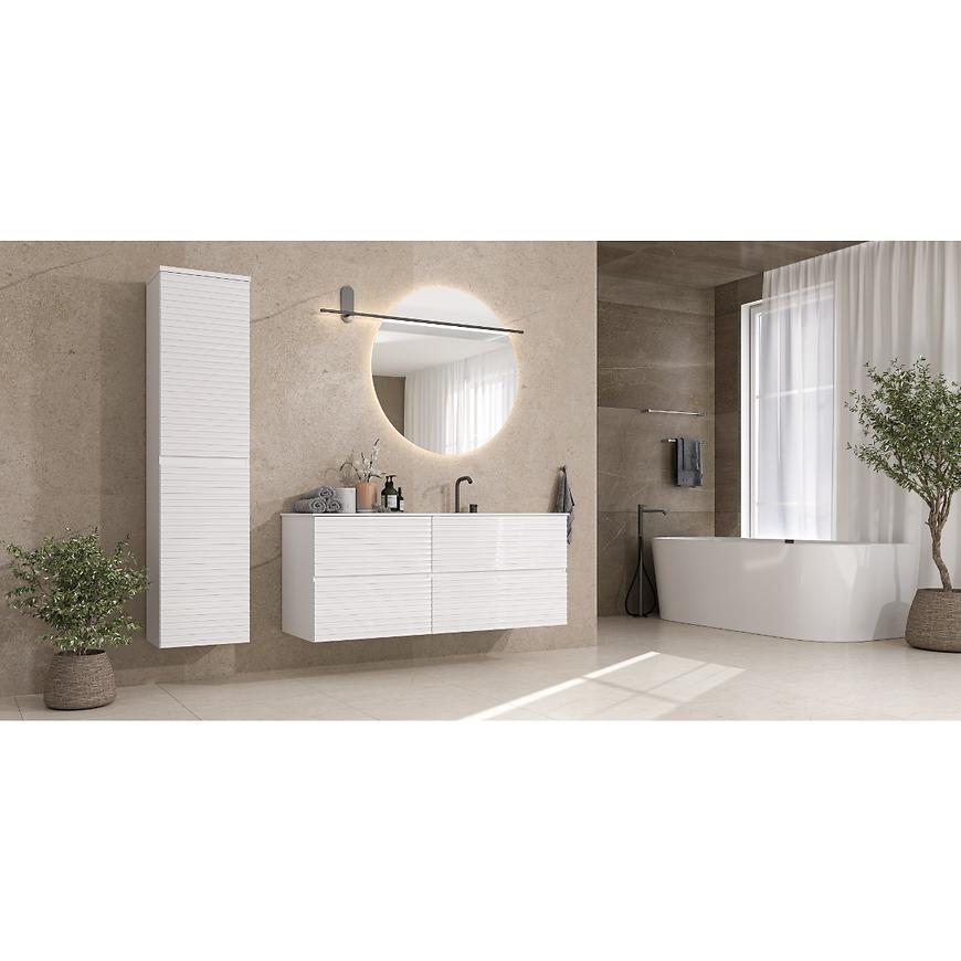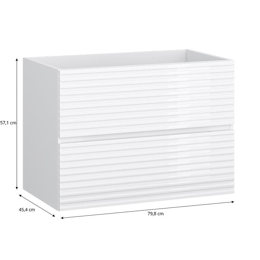 Szafka Bruno 80 biała to podwieszany mebel łazienkowy z kolekcji Bruno o wymiarach 57,1 × 79,8 × 45,4 cm i wadze 24,5 kg. Front wykonano z płyty MDF pokrytej folią PVC w białym połysku, a korpus z płyty wiórowej wykończonej białym matowym laminatem. Szafka posiada 2 szuflady z systemem samodomykania i wymaga samodzielnego montażu. Jest przeznaczona do umywalek Plaza 80, Plan 80 lub Sky 80, stanowiąc funkcjonalne i eleganckie rozwiązanie do łazienki.