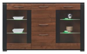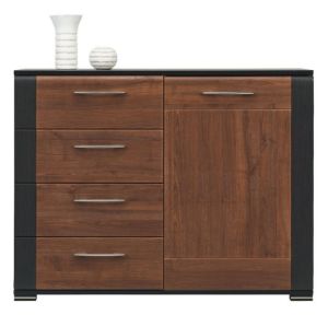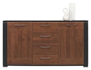 Kolekcja Naomi to połączenie klasycznej elegancji i funkcjonalności, które doskonale sprawdzi się zarówno w pokoju dziennym, jak i sypialni. Meble wykonane są z wysokiej jakości płyty laminowanej, a ich korpusy i fronty utrzymane w ciepłym kolorze orzecha podkreślają ponadczasowy styl wnętrza. Matowe wykończenie nadaje im subtelnej elegancji, a ozdobne, delikatnie zaokrąglone listwy w odcieniu wenge dodają wyjątkowego charakteru.