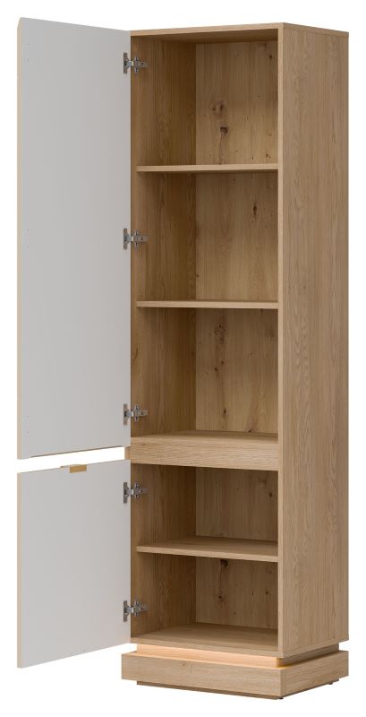 Wnętrza mebli zostały zaprojektowane z myślą o wygodzie codziennego użytkowania. Szuflady wyposażono w prowadnice kulkowe z pełnym wysuwem, co ułatwia dostęp do przechowywanych przedmiotów, a drzwi z systemem cichego domykania zwiększają komfort i eliminują nieprzyjemne trzaski. Korpusy mebli wykonano w dekorze dębu Cremona Torro, który wprowadza do wnętrza naturalne ciepło i doskonale uzupełnia kolorystykę frontów.