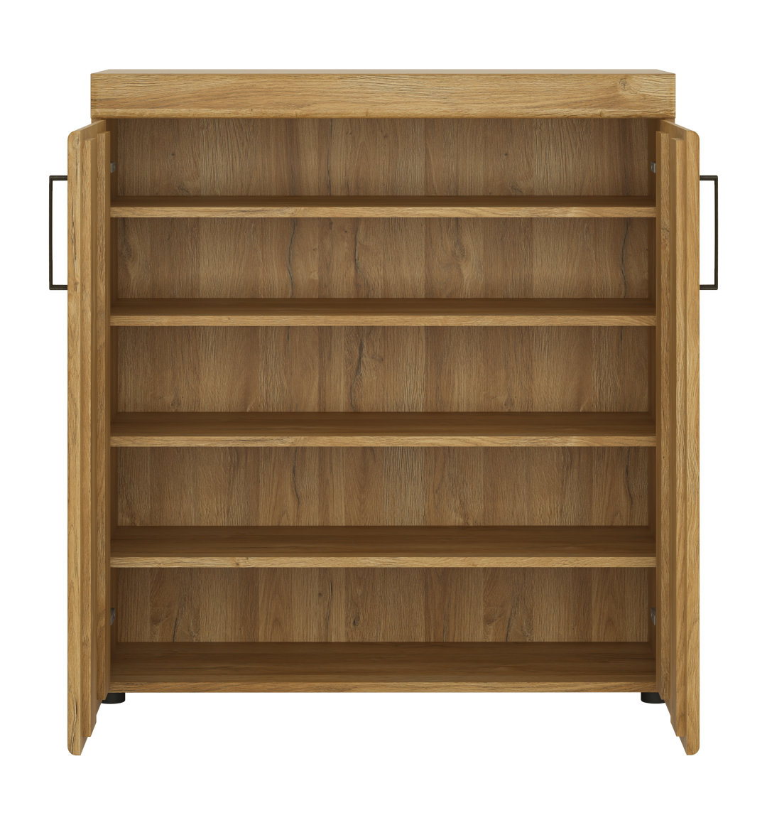 Szafka na buty Cortina 2D CNAG01 to stylowy i praktyczny mebel, który pomoże utrzymać porządek w Twoim przedpokoju. Dzięki pięciu przestronnym półkom z łatwością pomieści różne rodzaje obuwia – od lekkich sandałów, przez codzienne pantofle, aż po eleganckie szpilki. Dwudrzwiowa konstrukcja sprawia, że buty są dyskretnie schowane, a przedpokój zyskuje estetyczny i uporządkowany wygląd.