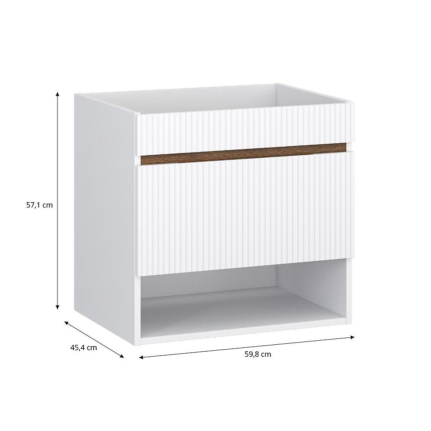 Szafka Joy 60 1S biała to podwieszany mebel łazienkowy z kolekcji Joy o wymiarach 57,1 × 59,8 × 45,4 cm i wadze 17 kg. Front wykonano z płyty MDF pokrytej białą matową folią PVC, a korpus z płyty wiórowej wykończonej laminatem w tym samym kolorze. Szafka posiada 1 szufladę, wyposażona jest w system samodomykania i wymaga samodzielnego montażu. Dedykowana jest do umywalek Plaza 60, Plan 60 oraz Sky 60, oferując funkcjonalne miejsce do przechowywania w łazience.