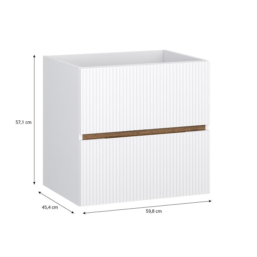 Szafka Joy 60 2S biała to podwieszany mebel łazienkowy z kolekcji Joy o wymiarach 57,1 × 59,8 × 45,4 cm i wadze 20,5 kg. Front wykonano z płyty MDF pokrytej białą matową folią PVC, a korpus z płyty wiórowej wykończonej laminatem w tym samym kolorze. Szafka posiada 2 szuflady, wyposażona jest w system samodomykania i wymaga samodzielnego montażu. Dedykowana jest do umywalek Plaza 60, Plan 60 oraz Sky 60, zapewniając praktyczne i funkcjonalne miejsce do przechowywania w łazience.