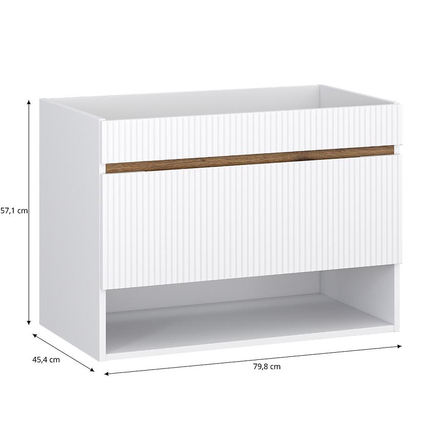 Szafka Joy 80 1S biała to podwieszany mebel łazienkowy z kolekcji Joy o wymiarach 57,1 × 79,8 × 45,4 cm i wadze 20 kg. Front wykonano z płyty MDF pokrytej białą matową folią PVC, a korpus z płyty wiórowej wykończonej laminatem w tym samym kolorze. Szafka posiada 1 szufladę, wyposażona jest w system samodomykania i wymaga samodzielnego montażu. Dedykowana jest do umywalek Plaza 80, Plan 80 oraz Sky 80, oferując funkcjonalne miejsce do przechowywania w łazience.