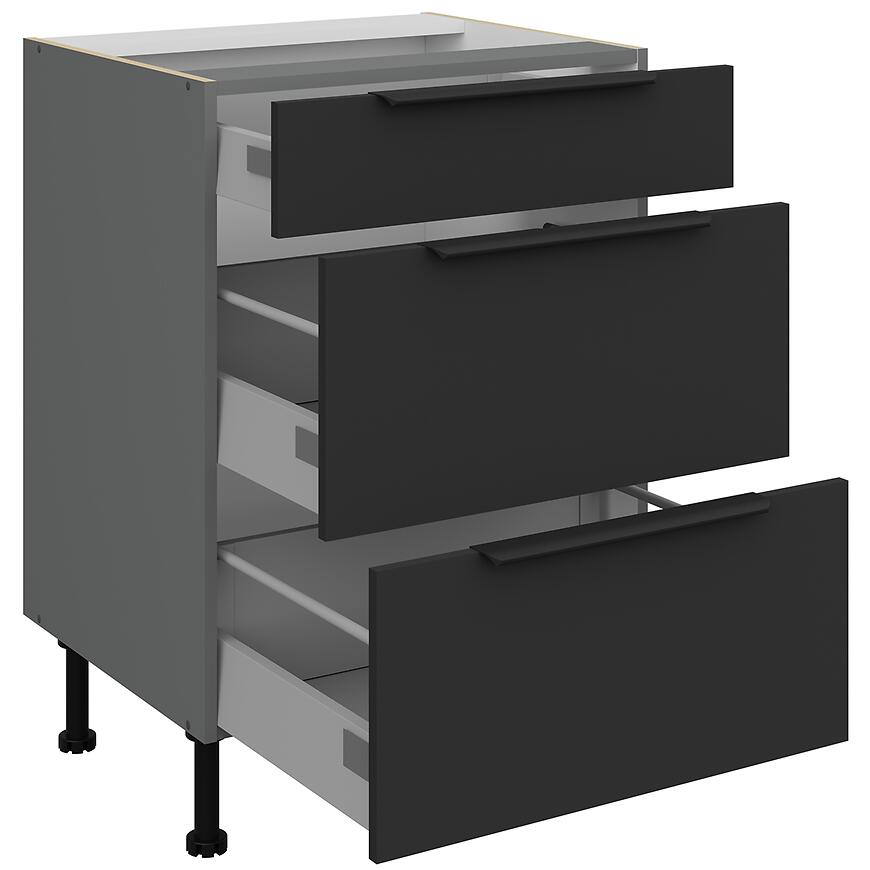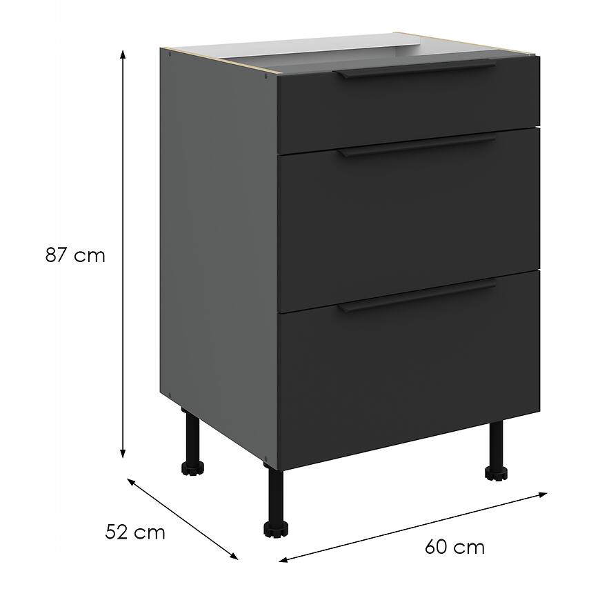 Szafka wykonana jest z laminowanej płyty wiórowej, co zapewnia wytrzymałość i odporność na codzienne użytkowanie. Cichy domyk w zestawie gwarantuje płynne zamykanie drzwi, eliminując hałas i zwiększając komfort pracy w kuchni. Szafka jest dostępna w kolorze czarnym dla frontów dolnych i szarym dla korpusu, co pozwala na stworzenie nowoczesnej, eleganckiej aranżacji kuchennej.