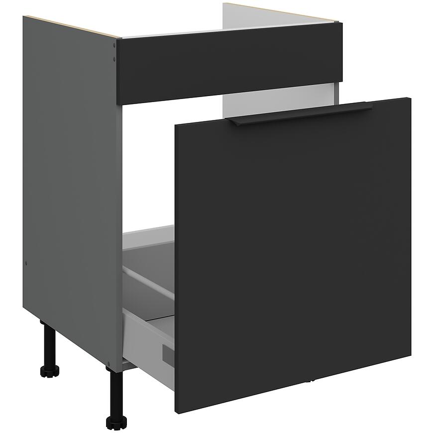 Szafka wykonana jest z laminowanej płyty wiórowej, co zapewnia wytrzymałość i odporność na codzienne użytkowanie. Cichy domyk w zestawie gwarantuje płynne zamykanie drzwi, eliminując hałas i zwiększając komfort pracy w kuchni. Szafka jest dostępna w kolorze czarnym dla frontów dolnych i szarym dla korpusu, co pozwala na stworzenie nowoczesnej, eleganckiej aranżacji kuchennej.