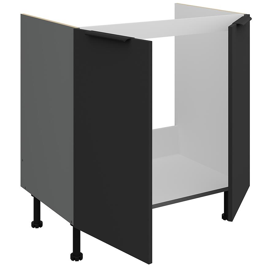 Szafka wykonana jest z laminowanej płyty wiórowej, co zapewnia wytrzymałość i odporność na codzienne użytkowanie. Cichy domyk w zestawie gwarantuje płynne zamykanie drzwi, eliminując hałas i zwiększając komfort pracy w kuchni. Szafka jest dostępna w kolorze czarnym dla frontów dolnych i szarym dla korpusu, co pozwala na stworzenie nowoczesnej, eleganckiej aranżacji kuchennej.