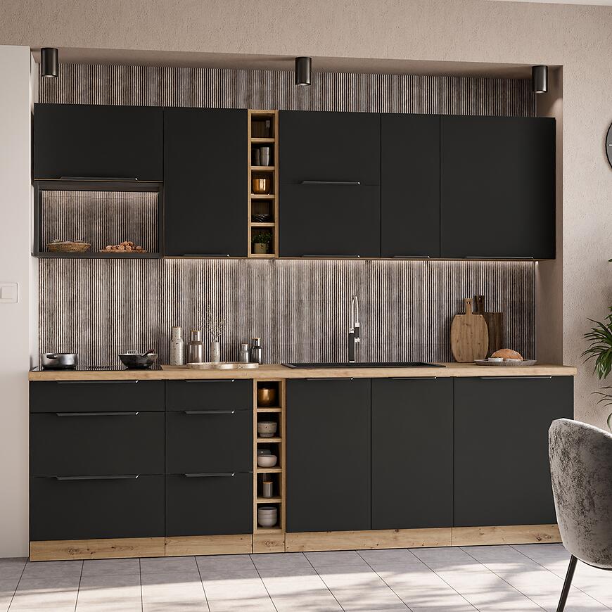 Fronty w kolorze BLACK AFM prezentują głęboką, matową czerń, która w połączeniu z wykończeniem Anti Fingerprint pozwala utrzymać idealną czystość powierzchni – bez widocznych odcisków palców i smug. Matowe wykończenie nadaje meblowi elegancki, nowoczesny charakter, idealny do wnętrz w stylu industrialnym, skandynawskim lub klasycznym. Czarne fronty górne tworzą subtelny kontrast z korpusem w kolorze dąb artisan, którego jasne drewnopodobne wybarwienie wprowadza do kuchni ciepło i naturalny akcent.