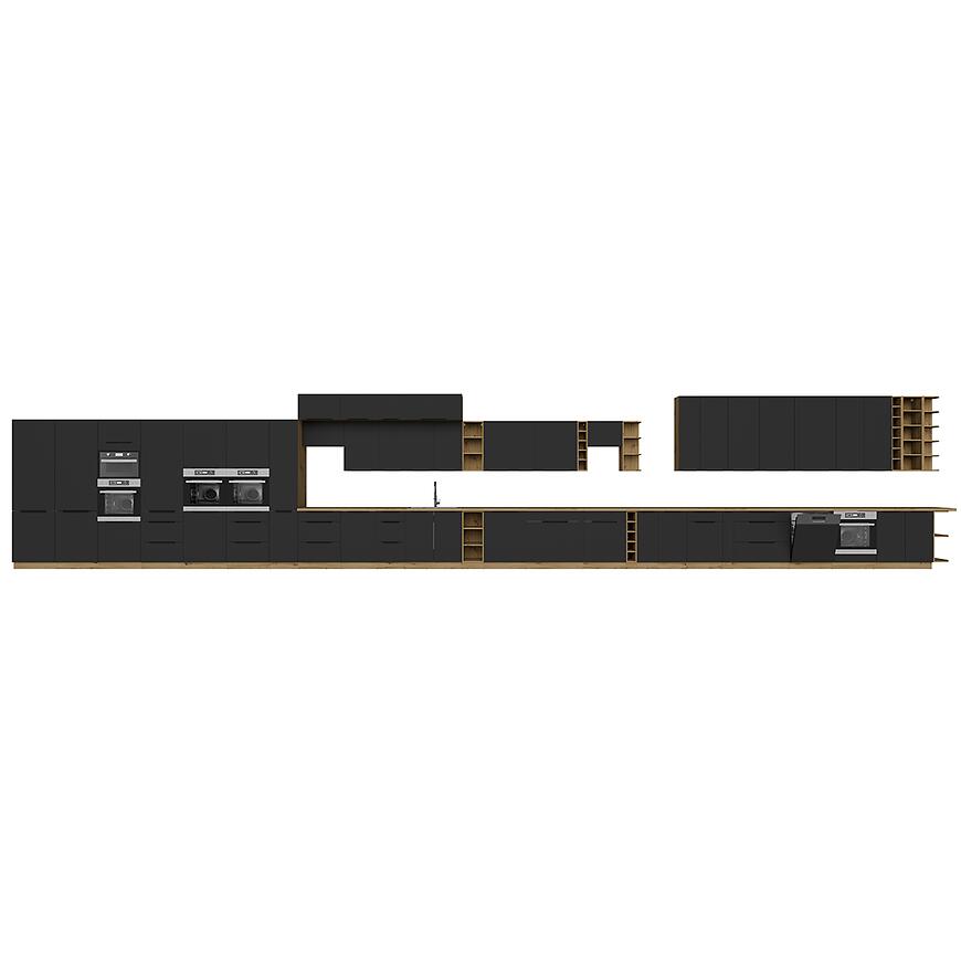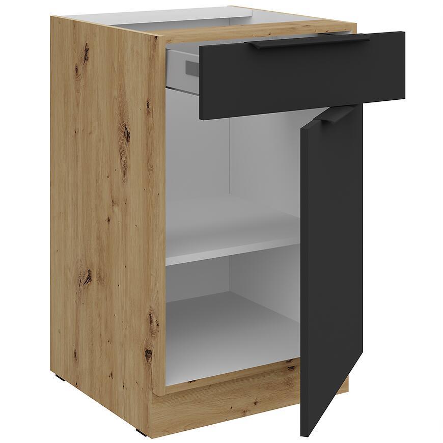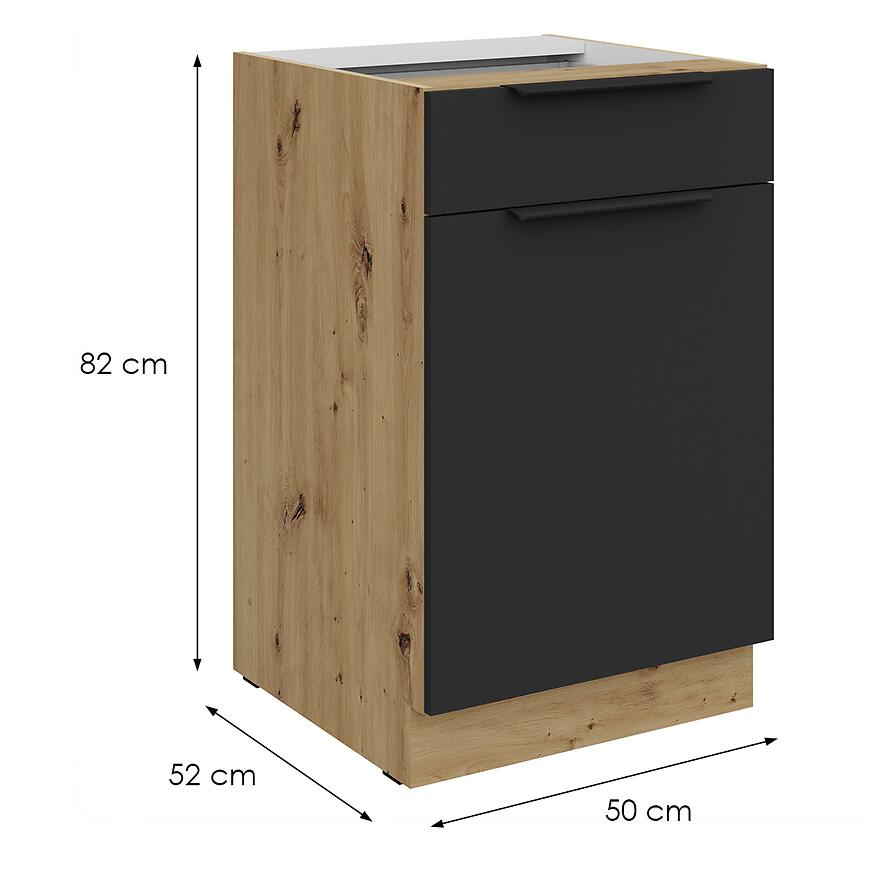 Szafka Aria-Bl/Ar Anti Fingerprint oferuje jedną szufladę i front, które umożliwiają wygodne przechowywanie akcesoriów kuchennych. Matowe czarne fronty są odporne na odciski palców, co ułatwia utrzymanie czystości, a jasny korpus w drewnopodobnym wybarwieniu wprowadza harmonię i lekkość do wnętrza.