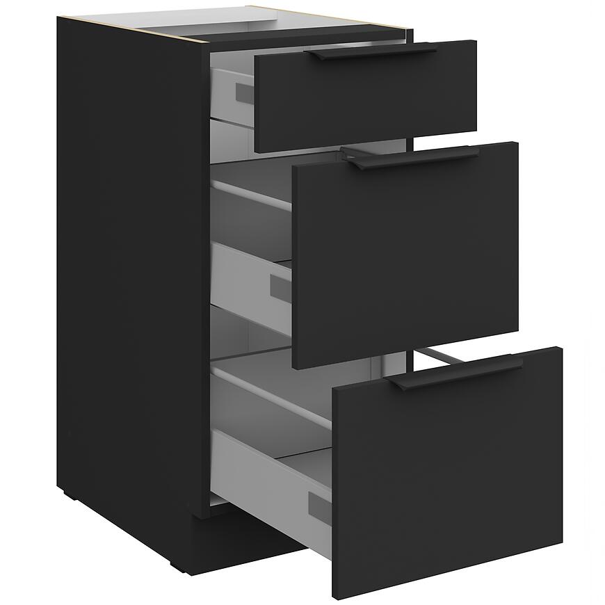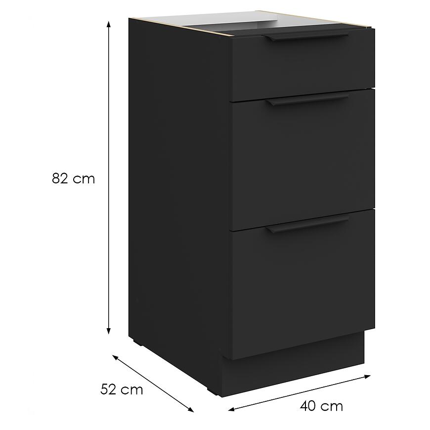 Model Aria-Bl/Bl Anti Fingerprint 40d 3s Bb to dolna szafka z kolekcji Aria Black, idealna do nowoczesnych kuchni. Jej czarne, matowe wykończenie nadaje wnętrzu elegancki i ponadczasowy charakter. Szafka wyposażona jest w trzy pojemne szuflady, które ułatwiają utrzymanie porządku i zapewniają wygodny dostęp do przechowywanych przedmiotów.