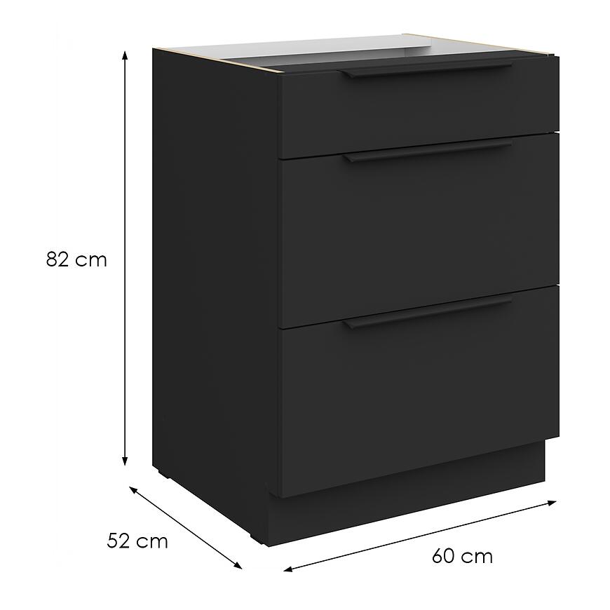 Szafka Aria-Bl/Bl Anti Fingerprint 60d 3s Bb z kolekcji Aria Black to dolny mebel kuchenny wyposażony w trzy pojemne szuflady, idealny do przechowywania sztućców, naczyń i akcesoriów kuchennych. Dzięki powłoce Anti Fingerprint fronty pozostają czyste i estetyczne, a matowe wykończenie nadaje elegancki wygląd.