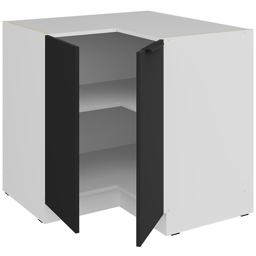 Szafka Aria-Bl/Wh Anti Fingerprint 90x90 Dn 2f Bb z kolekcji Aria Black to narożny mebel kuchenny, który maksymalnie wykorzystuje przestrzeń w rogach kuchni. Matowe czarne fronty w połączeniu z białym korpusem tworzą elegancki kontrast, który doskonale wpisuje się w nowoczesne aranżacje.