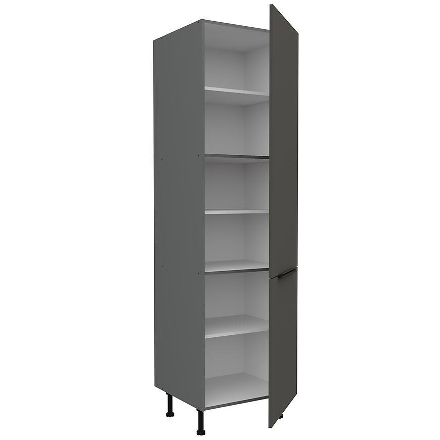 Model 60dk-215 2f z kolekcji Aria Graphite to wysoka szafka kolumnowa o wymiarach 215 × 60 × 57 cm. Zaprojektowana z myślą o kuchniach nowoczesnych, łączy elegancki wygląd z praktycznym rozplanowaniem przestrzeni do przechowywania.