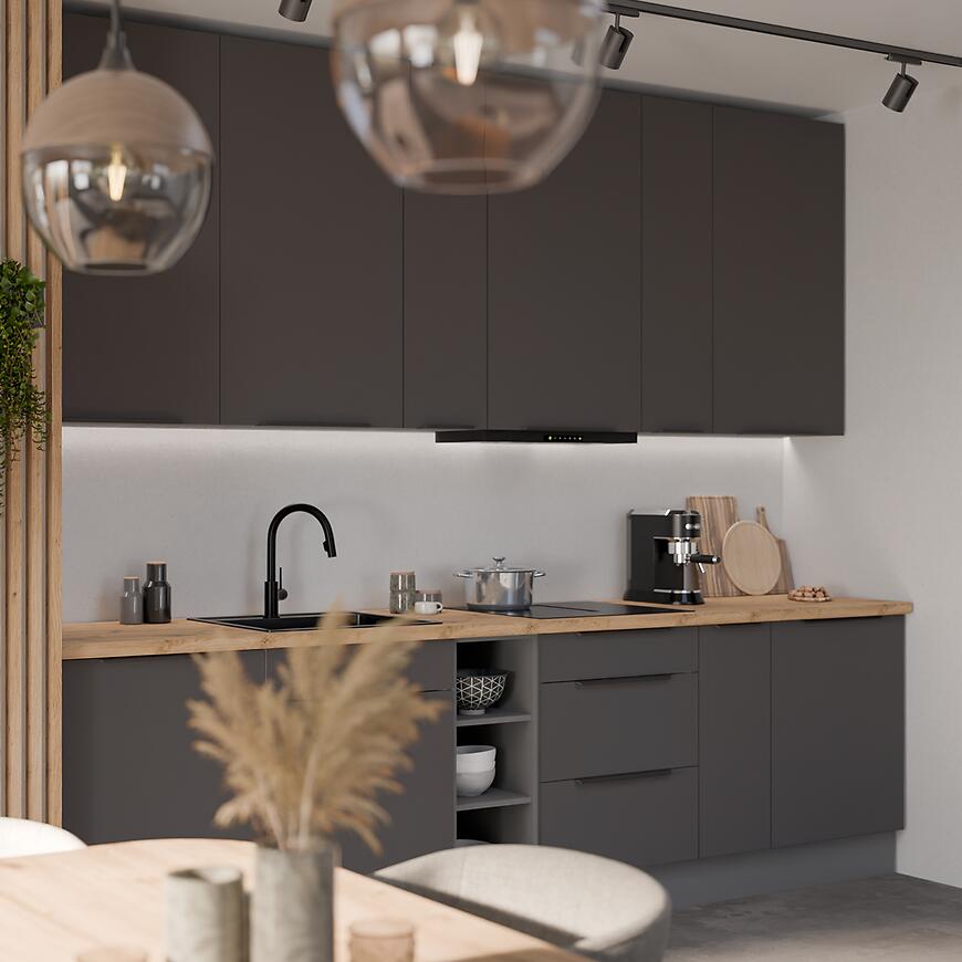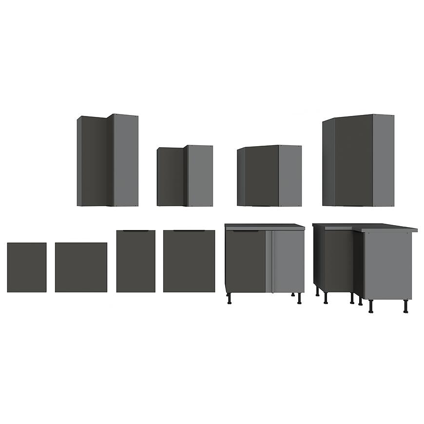 Model należy do kategorii szafek kuchennych górnych narożnych i wymaga złożenia, co umożliwia dopasowanie do indywidualnego układu kuchni. Grafitowy front w połączeniu z szarym korpusem tworzy elegancką i nowoczesną aranżację, nadając wnętrzu spójny styl.