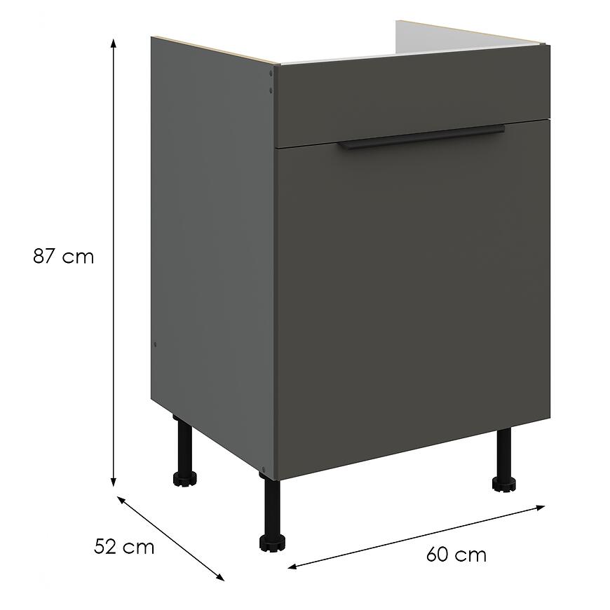 Szafka ma wymiary wysokość 87 cm, szerokość 60 cm i głębokość 52 cm, co zapewnia optymalną przestrzeń do przechowywania naczyń, garnków, produktów spożywczych lub innych akcesoriów kuchennych. Pojedyncza, pojemna szuflada z systemem cichego domyku gwarantuje wygodę użytkowania oraz eliminuje nieprzyjemny hałas podczas zamykania, co znacząco zwiększa komfort w codziennym użytkowaniu. Cokół i nóżki w kolorze korpusu zapewniają stabilność szafki oraz pozwalają na estetyczne ustawienie w zabudowie kuchennej.