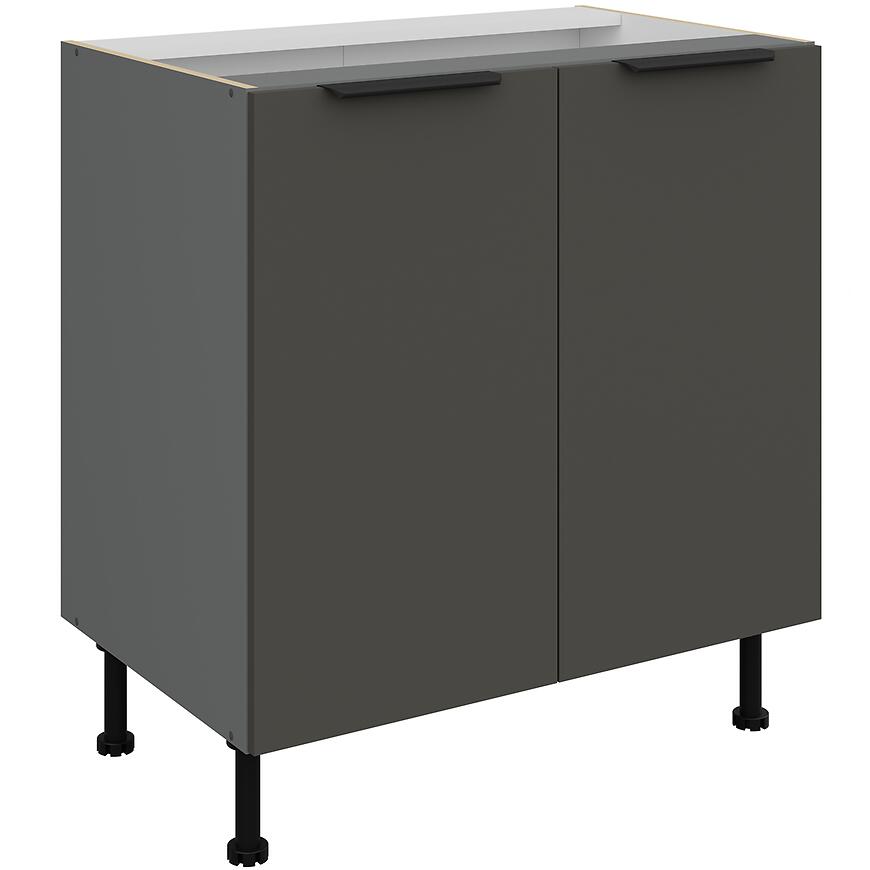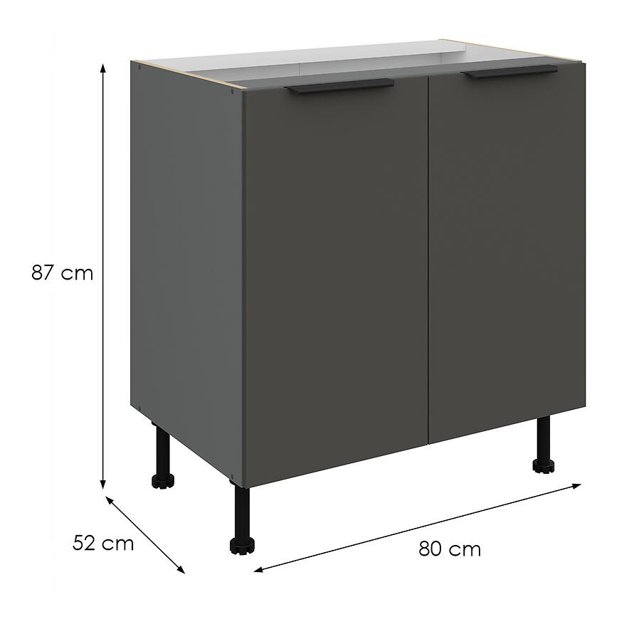 Szafka ma wysokość 87 cm, szerokość 80 cm i głębokość 52 cm, co zapewnia optymalną przestrzeń do przechowywania akcesoriów kuchennych, garnków, naczyń czy produktów spożywczych. Posiada dwa fronty zamykane z funkcją cichego domyku, co zwiększa komfort użytkowania i eliminuje hałas przy zamykaniu. Cokół i nóżki w kolorze korpusu zapewniają stabilność i estetyczny wygląd, ułatwiając ustawienie szafki w dowolnym miejscu w kuchni.