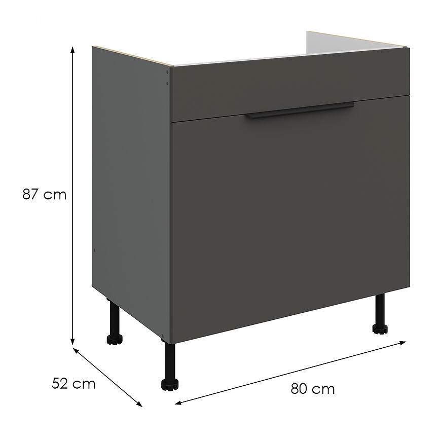 Szafka ma wysokość 87 cm, szerokość 80 cm i głębokość 52 cm, co zapewnia wygodne przechowywanie akcesoriów kuchennych, garnków i naczyń. Posiada jedną pojemną szufladę z cichym domykiem, co zwiększa komfort użytkowania i eliminuje hałas przy zamykaniu. Cokół i nóżki w kolorze korpusu zapewniają stabilność i wygodę ustawienia szafki w dowolnym miejscu kuchni.