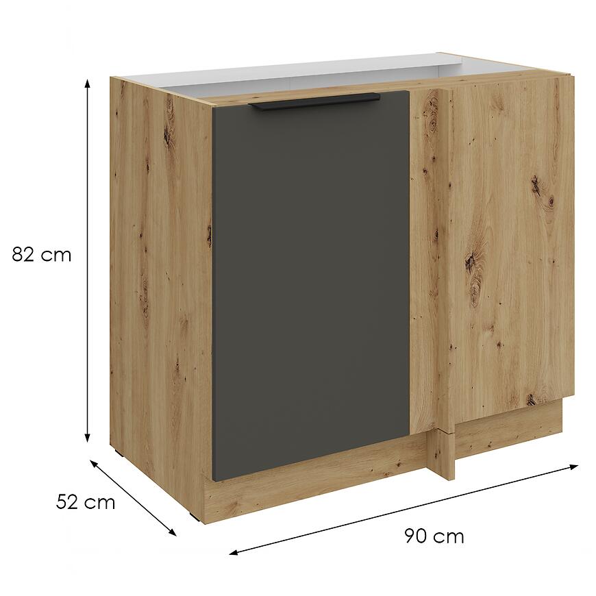 Korpus wykonany został z trwałej płyty wiórowej laminowanej w odcieniu dąb artisan, który pięknie kontrastuje z ciemnym frontem graphite. Jasne, drewnopodobne wybarwienie wprowadza do wnętrza ciepło i naturalny akcent, a zarazem świetnie komponuje się z elementami ze stali nierdzewnej, czerni czy bieli. Szafka posiada cokół w kolorze korpusu, co zapewnia spójną i estetyczną całość.