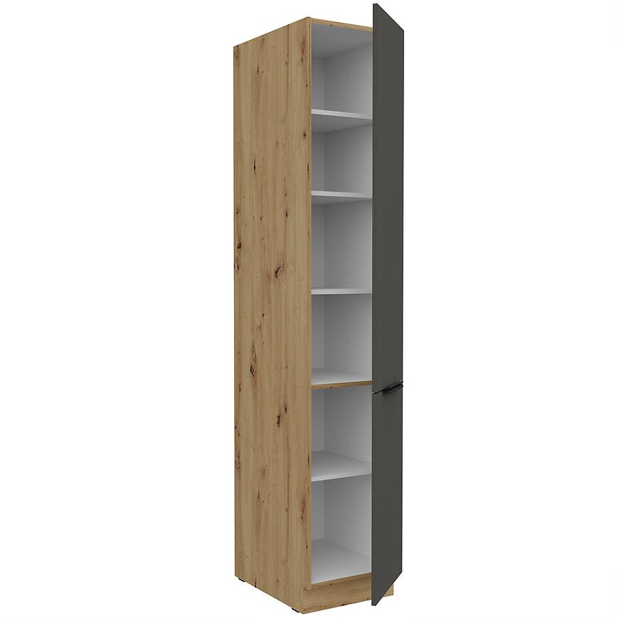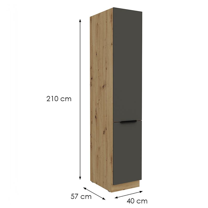 Szafka Kuchenna Aria-Gr/Ar Anti Fingerprint 40dk-210 2f z kolekcji ARIA GRAPHITE łączy elegancki design z funkcjonalnym układem wnętrza. Jej wymiary – wysokość 210 cm, szerokość 40 cm i głębokość 57 cm – sprawiają, że idealnie sprawdzi się w wąskich przestrzeniach kuchennych, oferując praktyczne miejsce do przechowywania naczyń, produktów i akcesoriów. Matowe fronty w kolorze graphite harmonizują z korpusem dąb artisan, tworząc nowoczesny i stylowy kontrast.