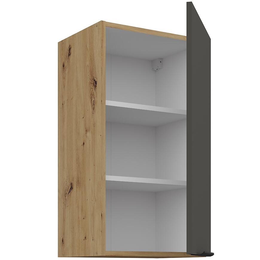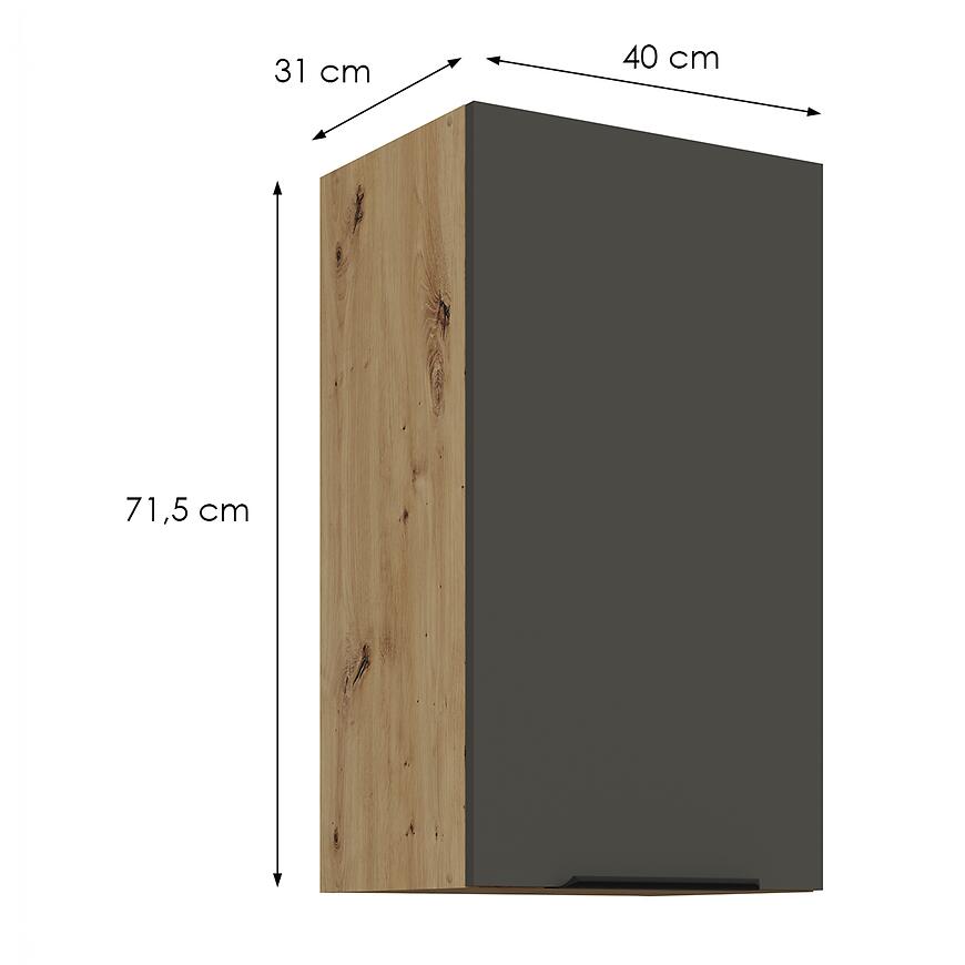 Szafka Kuchenna Aria-Gr/Ar Anti Fingerprint 40g-72 1F to elegancki element górnej zabudowy kuchennej, który łączy nowoczesny design z funkcjonalnością. Należy do kolekcji aria graphite, gdzie matowe fronty w kolorze GRAPHITE AFM zestawiono z jasnym drewnopodobnym korpusem w odcieniu dąb artisan, tworząc harmonijną i naturalną estetykę.