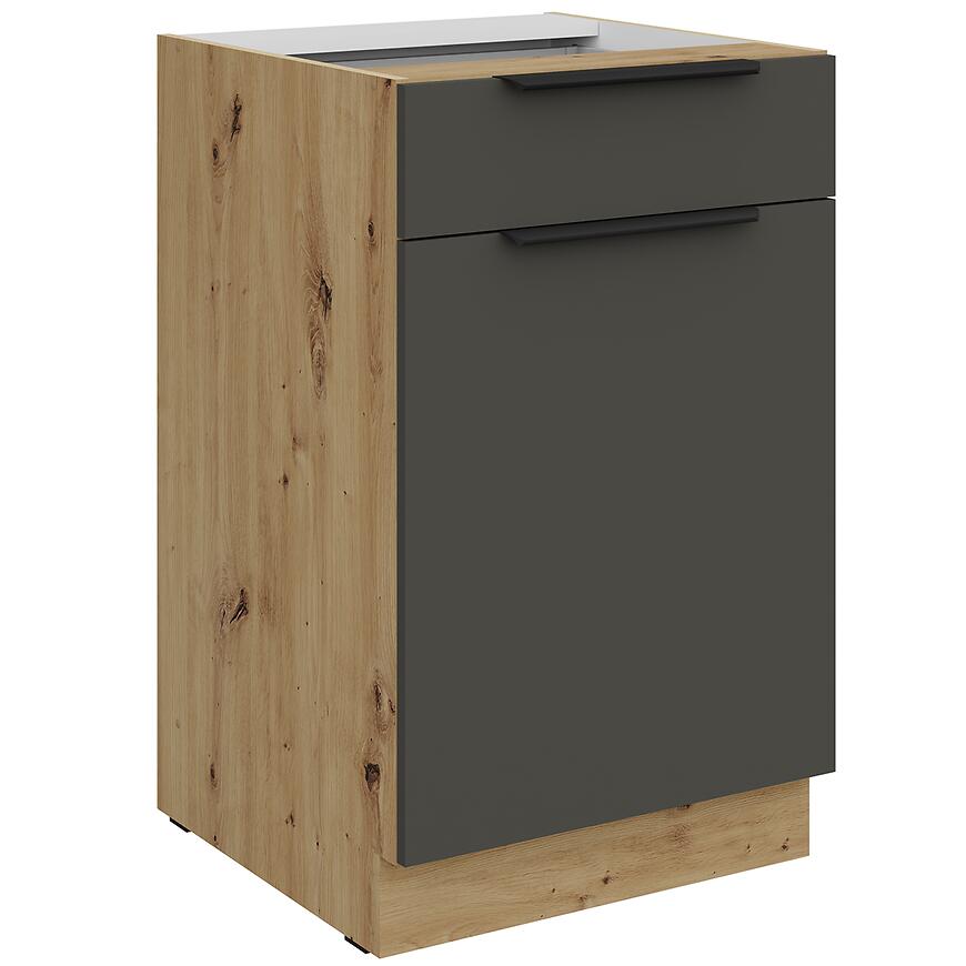 Dzięki połączeniu grafitowych frontów z drewnopodobnym korpusem w kolorze dąb artisan, szafka Aria-Gr/Ar tworzy wyjątkowo elegancką kompozycję. To propozycja dla osób poszukujących mebli kuchennych, które łączą estetykę z praktycznością. Kolekcja Aria Graphite pozwala na swobodne łączenie różnych modułów, dzięki czemu można zbudować kuchnię dopasowaną do indywidualnych potrzeb i rozkładu pomieszczenia.