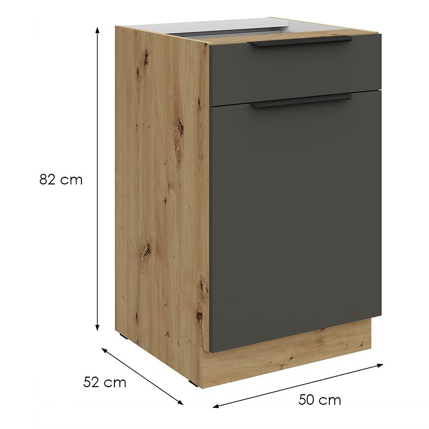 Korpus wykonany został z trwałej płyty wiórowej laminowanej w odcieniu dąb artisan, który pięknie kontrastuje z ciemnym frontem graphite. Jasne, drewnopodobne wybarwienie wprowadza do wnętrza ciepło i naturalny akcent, a zarazem świetnie komponuje się z elementami ze stali nierdzewnej, czerni czy bieli. Szafka posiada cokół w kolorze korpusu, co zapewnia spójną i estetyczną całość.