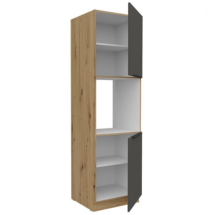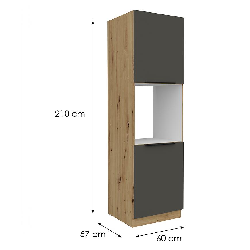 Szafka Kuchenna Aria-Gr/Ar Anti Fingerprint 60dp-210 2f z kolekcji ARIA GRAPHITE łączy elegancki design z funkcjonalnym układem wnętrza. Jej wymiary – wysokość 210 cm, szerokość 60 cm i głębokość 57 cm – pozwalają na optymalne wykorzystanie przestrzeni w zabudowie kolumnowej, oferując pojemne miejsce do przechowywania naczyń, produktów i akcesoriów kuchennych. Matowe fronty w kolorze graphite harmonizują z korpusem dąb artisan, tworząc elegancki kontrast i nowoczesny akcent w kuchni.