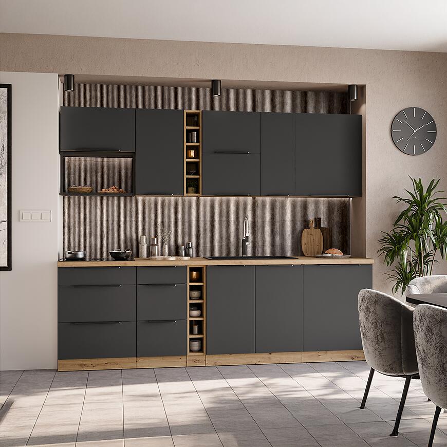 Szafka przeznaczona jest do samodzielnego montażu, co umożliwia precyzyjne dopasowanie jej do reszty zabudowy kuchennej. Cokół w kolorze korpusu ujednolica konstrukcję i podkreśla spójny wygląd mebla. Matowe fronty graphite, jasny korpus dąb artisan oraz funkcjonalne wnętrze sprawiają, że szafka doskonale wpisuje się w nowoczesne, eleganckie kuchnie.