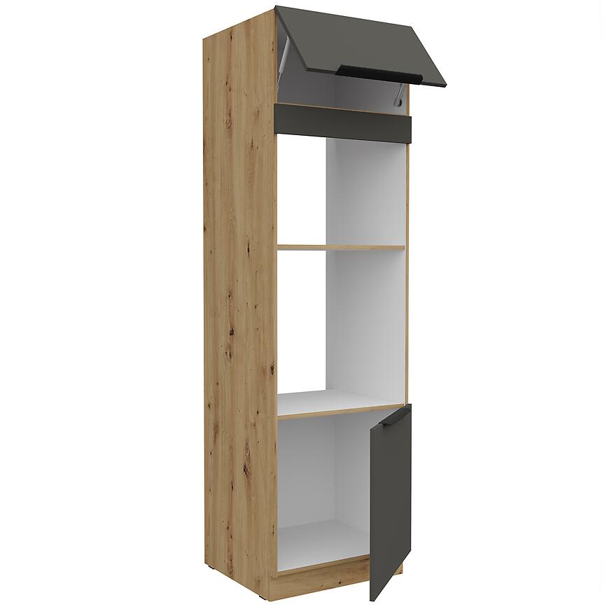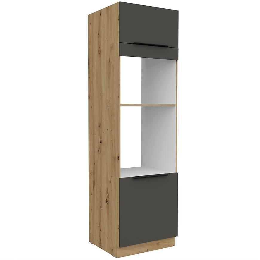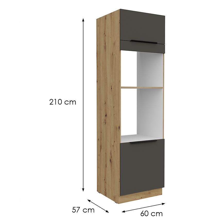 Szafka Kuchenna Aria-Gr/Ar Anti Fingerprint 60dpm-210 2f z kolekcji ARIA GRAPHITE łączy nowoczesny design z funkcjonalnym układem wnętrza. Jej wymiary – wysokość 210 cm, szerokość 60 cm i głębokość 57 cm – umożliwiają efektywne wykorzystanie przestrzeni w zabudowie kolumnowej, oferując pojemne miejsce do przechowywania naczyń, produktów i akcesoriów kuchennych. Matowe fronty w kolorze graphite harmonizują z korpusem dąb artisan, tworząc elegancki kontrast i nowoczesny akcent w kuchni.