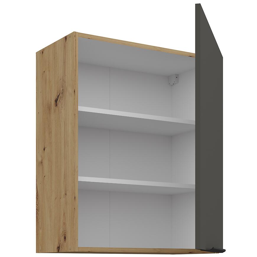 Korpus w kolorze dąb artisan, o jasnym drewnopodobnym wybarwieniu i matowym wykończeniu, harmonizuje z grafitowymi frontami, tworząc spójną i atrakcyjną stylistycznie całość. Zarówno fronty, jak i korpus wykonano z płyty wiórowej laminowanej, co zapewnia wytrzymałość, stabilność i odporność na codzienne obciążenia. Waga 17 kg świadczy o solidnej konstrukcji, odpowiedniej do górnych szafek.