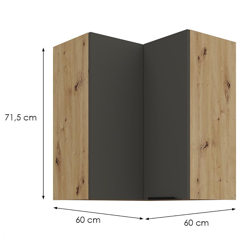 Szafka Kuchenna Aria-Gr/Ar Anti Fingerprint 60x60 Gn-72 2f (90°) to narożny model z kolekcji aria graphite, który łączy nowoczesny design z funkcjonalnością, idealny do górnej zabudowy kuchni. Dzięki wysokości 71,5 cm, szerokości 60 cm i głębokości 60 cm szafka oferuje przestronną powierzchnię do przechowywania naczyń, garnków i produktów spożywczych, maksymalnie wykorzystując narożne przestrzenie.