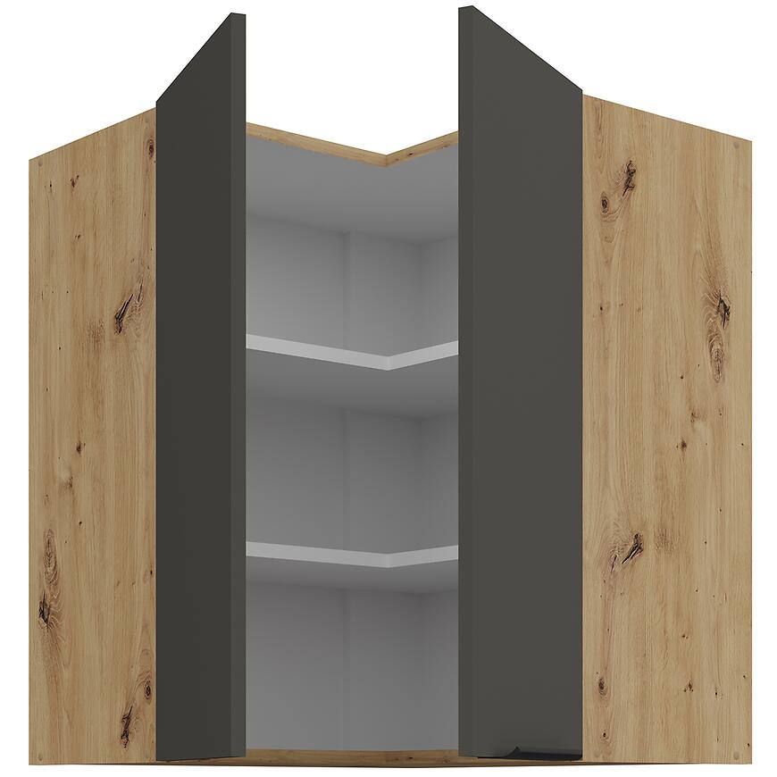 Korpus w jasnym, drewnopodobnym wybarwieniu dąb artisan harmonizuje z grafitowymi frontami, tworząc spójną i atrakcyjną wizualnie całość. Zarówno fronty, jak i korpus wykonano z płyty wiórowej laminowanej, co zapewnia stabilność, wytrzymałość i odporność na codzienne użytkowanie. Waga 22 kg podkreśla solidność konstrukcji i jej trwałość w narożnej zabudowie.