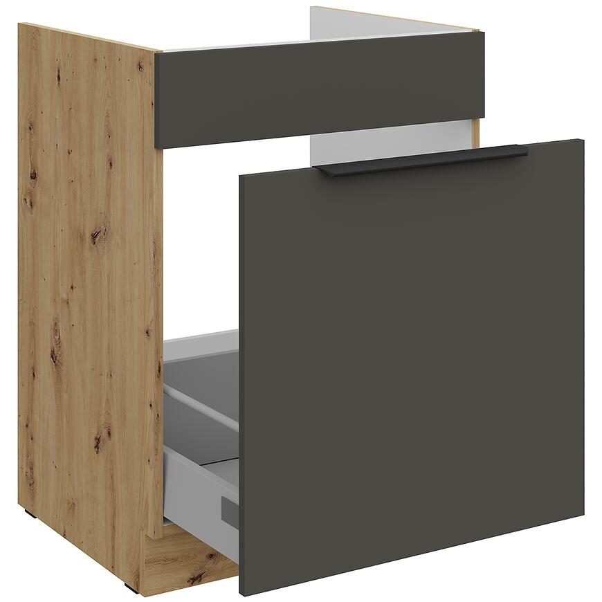 Korpus wykonany został z trwałej płyty wiórowej laminowanej w odcieniu dąb artisan, który pięknie kontrastuje z ciemnym frontem graphite. Jasne, drewnopodobne wybarwienie wprowadza do wnętrza ciepło i naturalny akcent, a zarazem świetnie komponuje się z elementami ze stali nierdzewnej, czerni czy bieli. Szafka posiada cokół w kolorze korpusu, co zapewnia spójną i estetyczną całość.