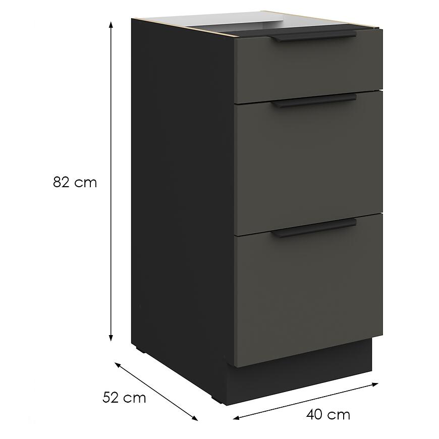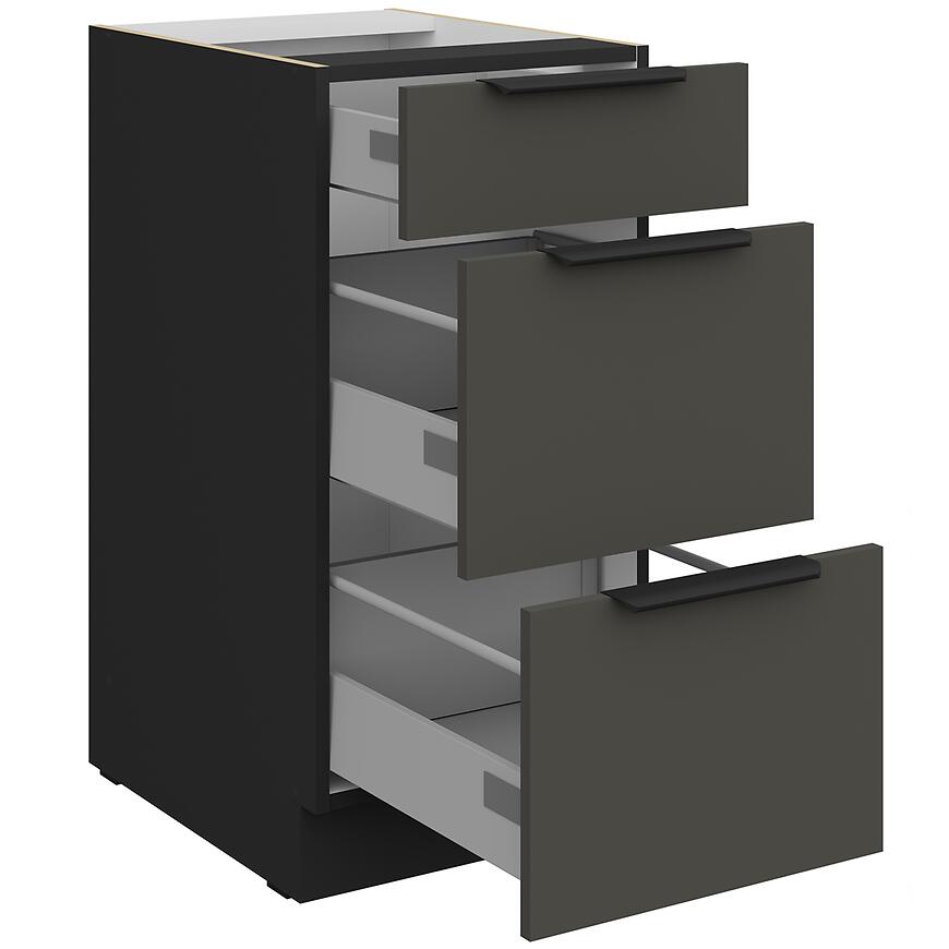 Szafka Aria-Gr/Bl 40d 3s Bb z kolekcji Aria Graphite to stylowa i funkcjonalna szafka dolna o szerokości 40 cm, idealna do nowoczesnych kuchni.