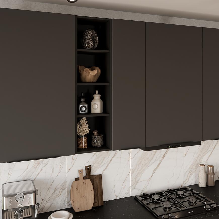 Fronty wykonano z płyty wiórowej laminowanej w kolorze graphite z matowym wykończeniem, które ogranicza widoczność odcisków palców. Korpus szafki wykonany z tej samej wysokiej jakości płyty, w kolorze czarnym i wykończeniu matowym, zapewnia spójny, nowoczesny wygląd całej kuchni. Dolne fronty mają subtelne szare wybarwienie, które dodaje kontrastu i elegancji. Szafka posiada cokół w kolorze korpusu, co ułatwia dopasowanie do innych elementów zabudowy kuchennej.
