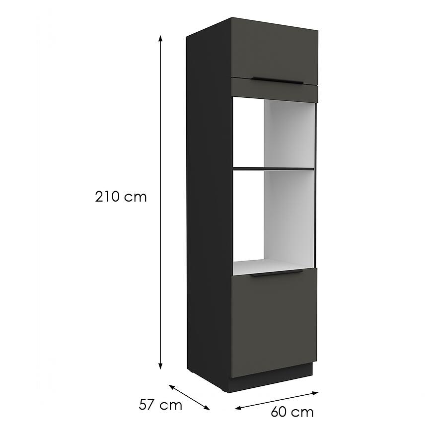 Szafka ma wysokość 210 cm, szerokość 60 cm i głębokość 57 cm, co czyni ją idealną jako szafka kolumnowa. Standardowe wymiary umożliwiają łatwe wkomponowanie szafki w zabudowę kuchenną lub ustawienie jej w konfiguracji modułowej z innymi meblami kuchennymi.
