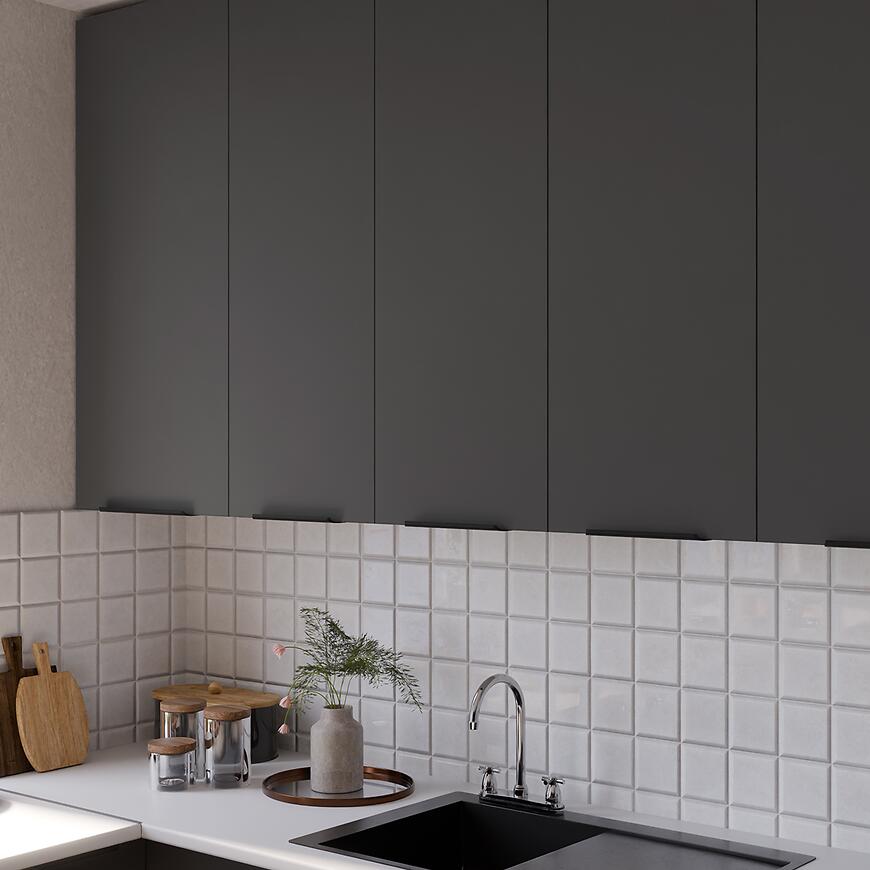 Szafka łączy elegancki odcień graphite frontów z białym korpusem. Matowe fronty zapobiegają pozostawaniu odcisków palców, dzięki czemu szafka zawsze wygląda estetycznie. Połączenie kolorów nadaje kuchni nowoczesny, minimalistyczny charakter i wprowadza jasny, przytulny klimat wnętrza.