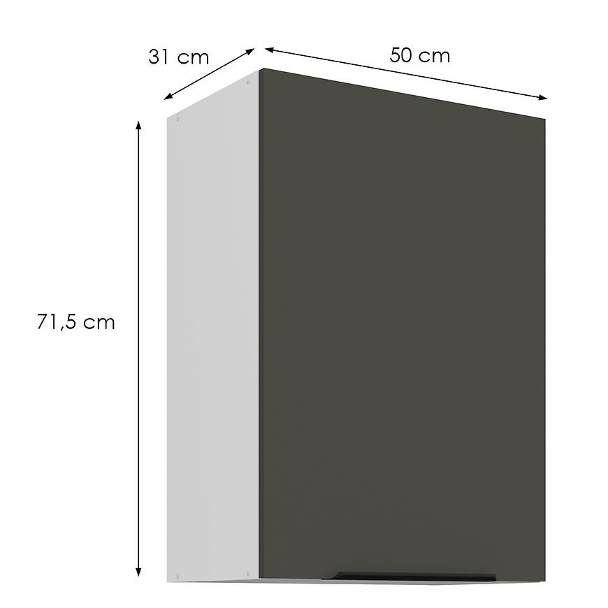 Szafka ma wysokość 71,5 cm, szerokość 50 cm i głębokość 31 cm, co sprawia, że idealnie nadaje się do górnych partii kuchni, oferując wygodną przestrzeń do przechowywania naczyń i akcesoriów kuchennych.