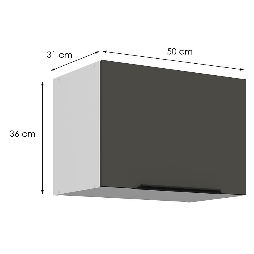 Szafka kuchenna Aria-Gr/Wh Anti Fingerprint 50gu-36 1f. Niska górna szafka o wysokości 36 cm, z matowymi frontami GRAPHITE AFM i białym korpusem. Wyposażona w cichy domyk, lekka i funkcjonalna.