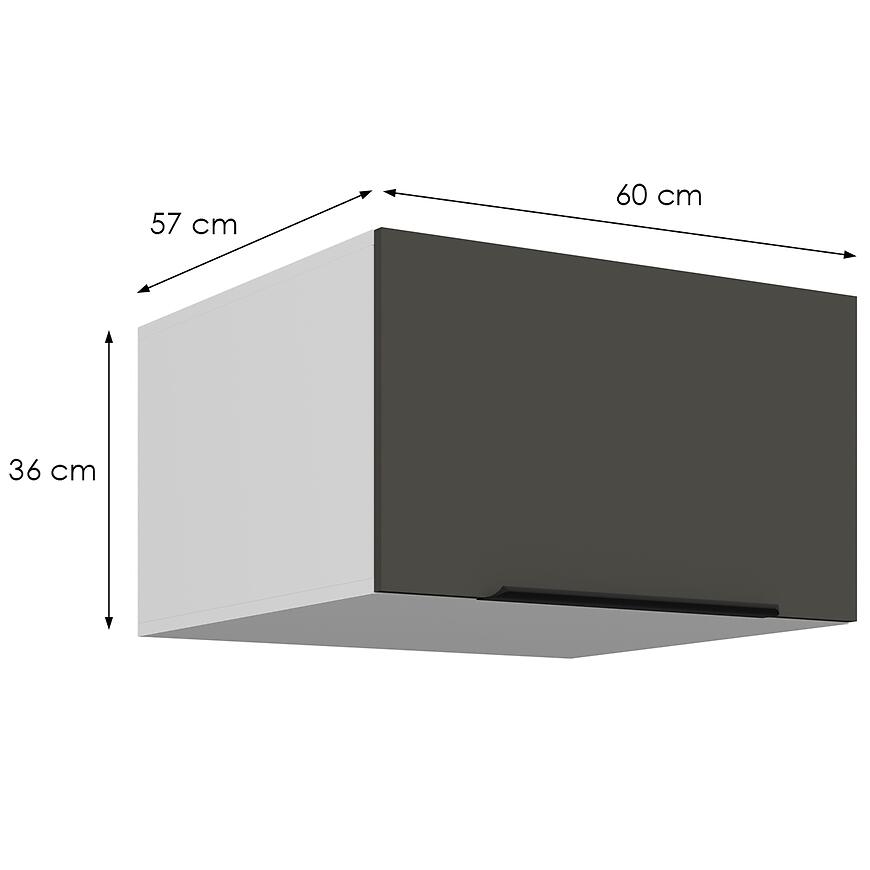 Szafka ma wysokość 36 cm, szerokość 60 cm i głębokość 57 cm, co sprawia, że idealnie nadaje się do górnych partii kuchni, oferując przestronną powierzchnię do przechowywania naczyń i akcesoriów kuchennych.