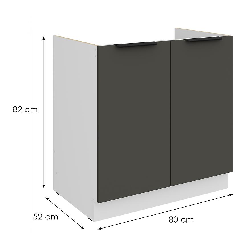 Szafka ma wysokość 82 cm, szerokość 80 cm i głębokość 52 cm. Dwa fronty dolne zapewniają pojemne miejsce do przechowywania naczyń, garnków i innych akcesoriów kuchennych. Produkt należy do dolnych szafek kuchennych i łatwo dopasować go do pozostałych elementów zabudowy kuchennej.